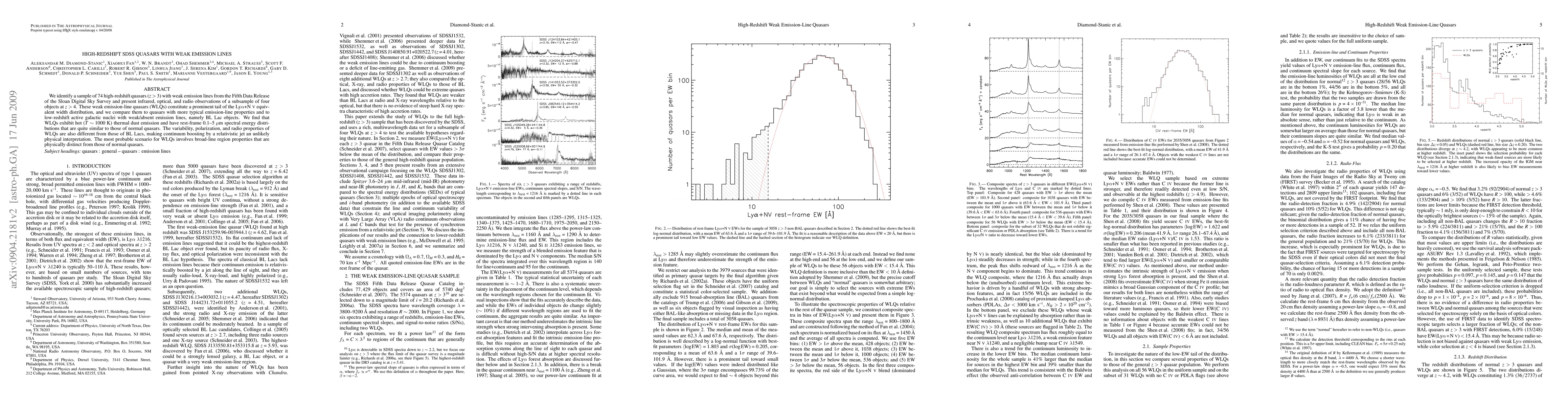 This study identifies 74 high-redshift quasars with weak emission lines from the SDSS, finding they exhibit hot thermal dust emission and similar spectral energy distributions to normal quasars. Unlike BL Lac objects, these weak emission-line quasars (WLQs) suggest distinct broad-line region properties rather than continuum boosting by relativistic jets.