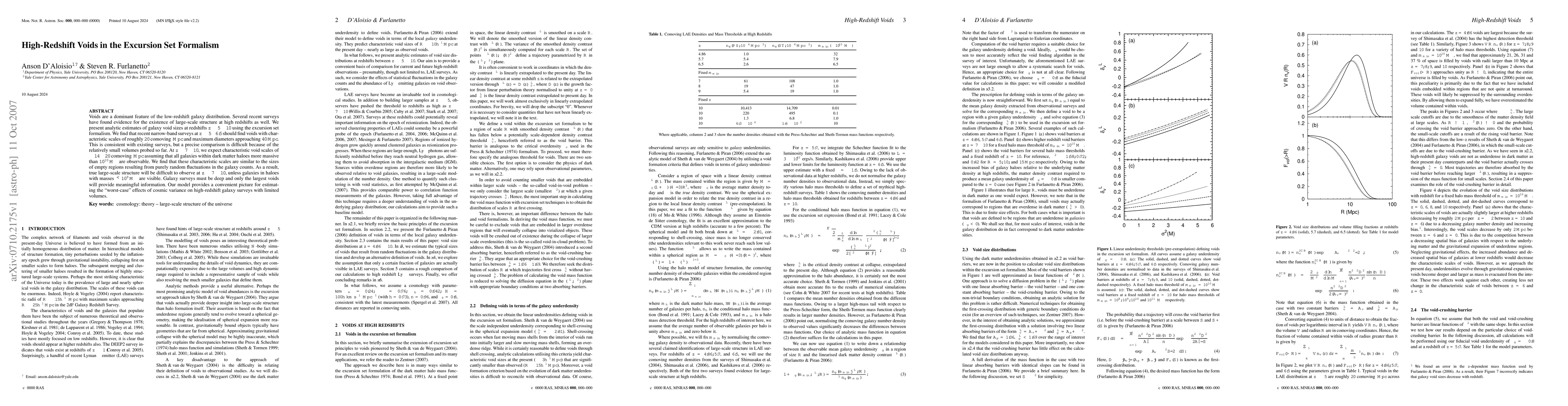This paper uses the excursion set formalism to estimate the sizes of galaxy voids at high redshifts (z ~ 5-10). It predicts that voids at z ~ 5-6.5 should have characteristic scales of ~20 comoving Mpc, while at z ~ 7-10, voids may be around 14-20 comoving Mpc, making large-scale structure difficult to observe unless fainter galaxies are detected.