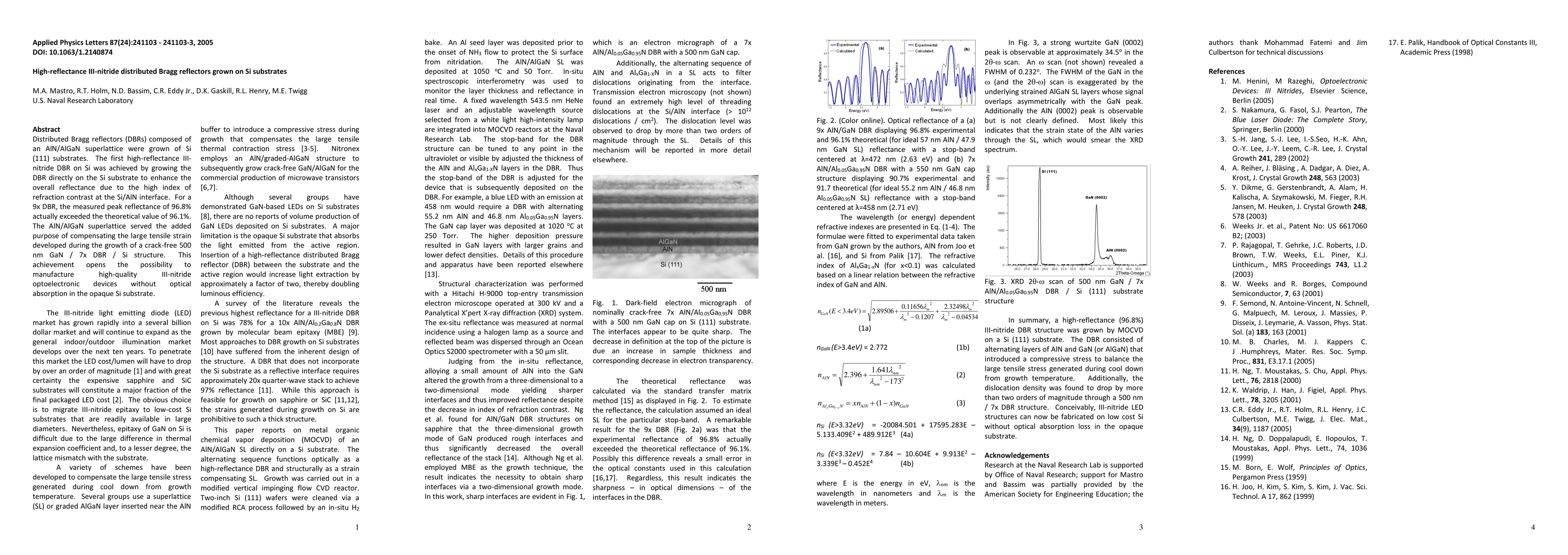 This paper reports the successful growth of high-reflectance III-nitride distributed Bragg reflectors (DBRs) on Si substrates, achieving a peak reflectance of 96.8% for a 9x DBR, surpassing theoretical predictions. The AlN/AlGaN superlattice also compensates for tensile strain, enabling crack-free structures and paving the way for high-quality optoelectronic devices on Si.