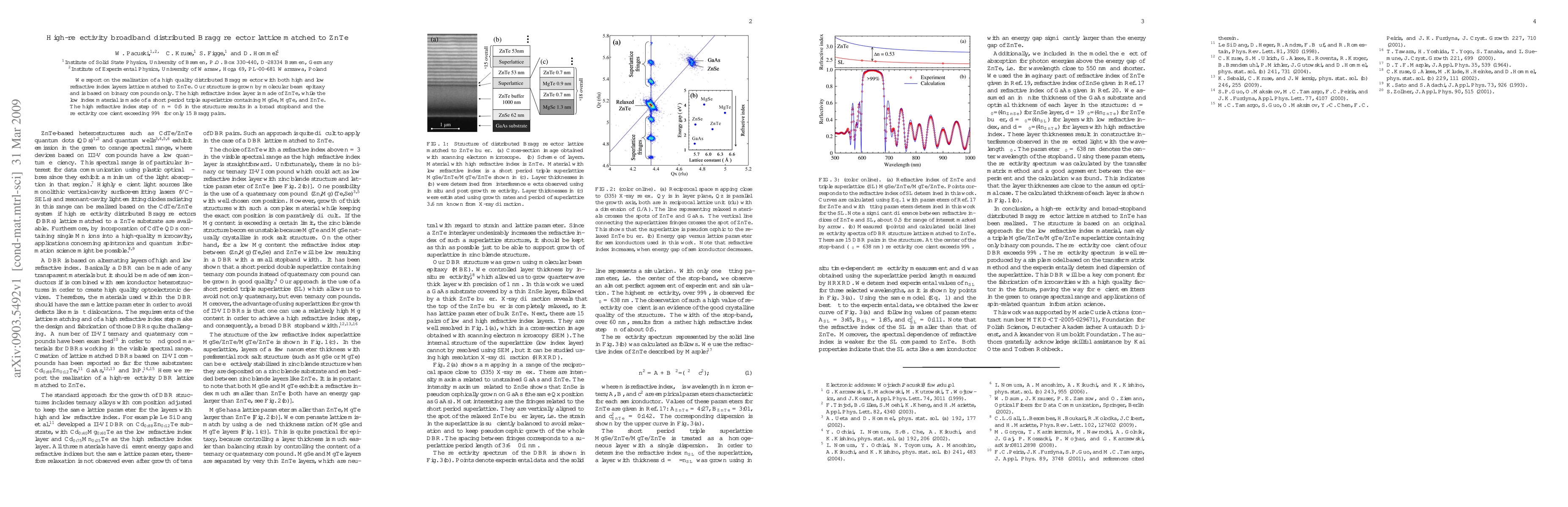 We report on the realization of a high quality distributed Bragg reflector with both high and low refractive index layers lattice matched to ZnTe. Our structure is grown by molecular beam epitaxy and is based on binary compounds only. The high refractive index layer is made of ZnTe, while the low index material is made of a short period triple superlattice containing MgSe, MgTe, and ZnTe. The high refractive index step of Delta_n=0.5 in the structure results in a broad stopband and the reflectivity coefficient exceeding 99% for only 15 Bragg pairs.
