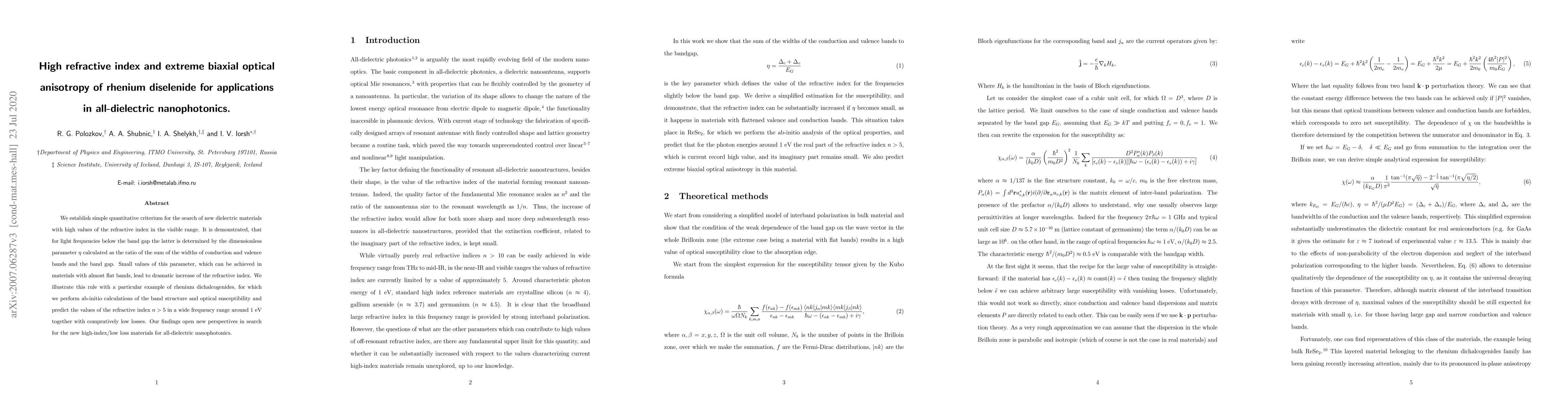 This paper proposes a quantitative criterion for identifying dielectric materials with high refractive indices, demonstrating that rhenium diselenide exhibits a refractive index greater than 5 in the visible range due to its nearly flat conduction and valence bands. The findings suggest rhenium diselenide as a promising material for all-dielectric nanophotonic applications.