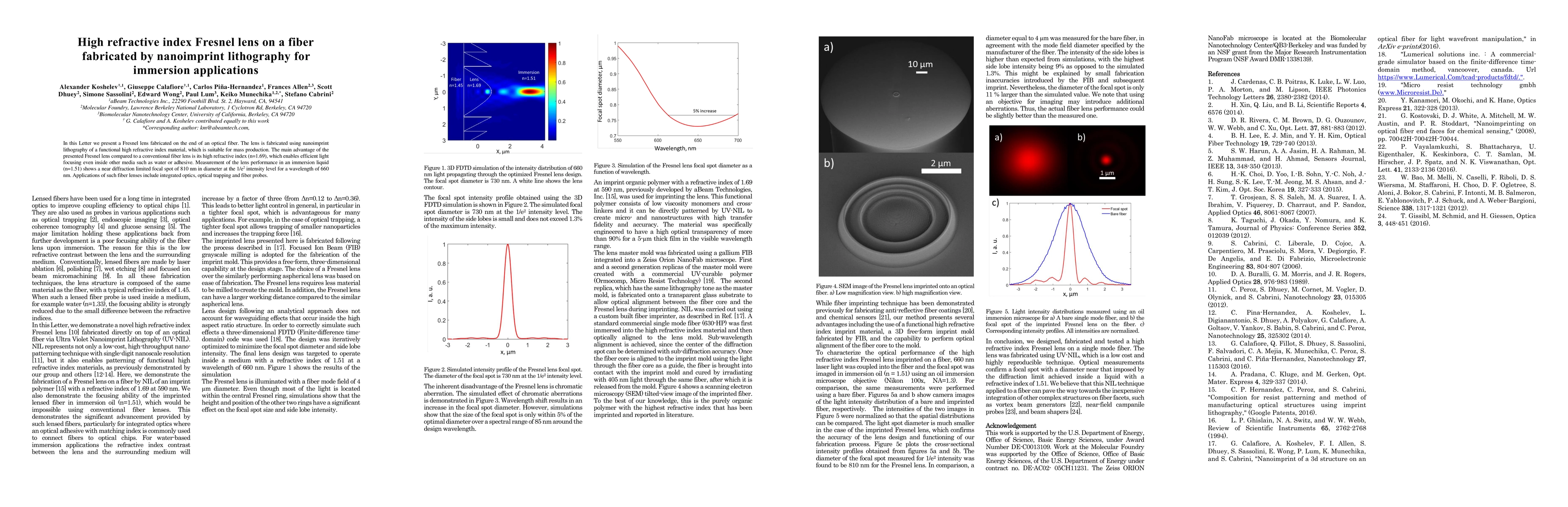 This research presents a high refractive index Fresnel lens on an optical fiber fabricated via nanoimprint lithography, enabling efficient light focusing in immersion media like water, and demonstrating near diffraction-limited performance in such conditions. Potential applications include integrated optics and fiber probes.
