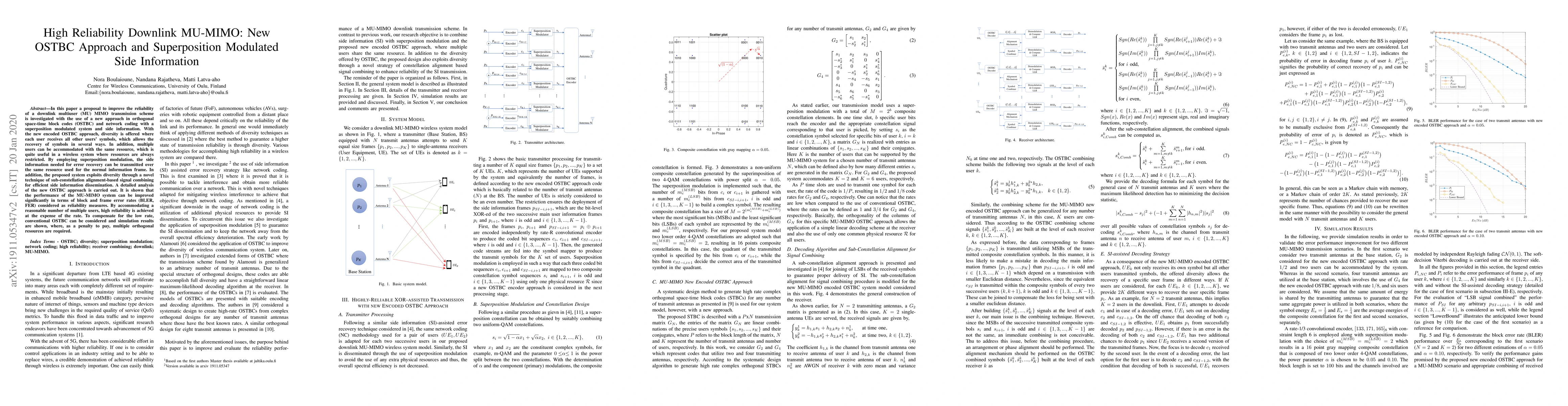 In this paper, a proposal to improve the reliability of a downlink multiuser (MU) MIMO transmission scheme is investigated with the use of a new approach in orthogonal space-time block codes (OSTBC) and network coding with a superposition modulated system and side information. With the new encoded OSTBC approach, diversity is offered where each user receives all other users' symbols, which allows the recovery of symbols in several ways. In addition, multiple users can be accommodated with the same resource, which is quite useful in a wireless system where resources are always restricted. By employing superposition modulation, the side information needed for error recovery can be transmitted over the same resource used for the normal information frame. In addition, the proposed system exploits diversity through a novel technique of sub-constellation alignment-based signal combining for efficient side information dissemination. A detailed analysis of the new OSTBC approach is carried out. It is shown that the performance of the MU-MIMO system can be improved significantly in terms of block and frame error rates (BLER, FER) considered as reliability measures. By accommodating a reasonable number of multiple users, high reliability is achieved at the expense of the rate. To compensate for the low rate, conventional OSTBC can be considered and simulation results are shown, where, as a penalty to pay, multiple orthogonal resources are required.