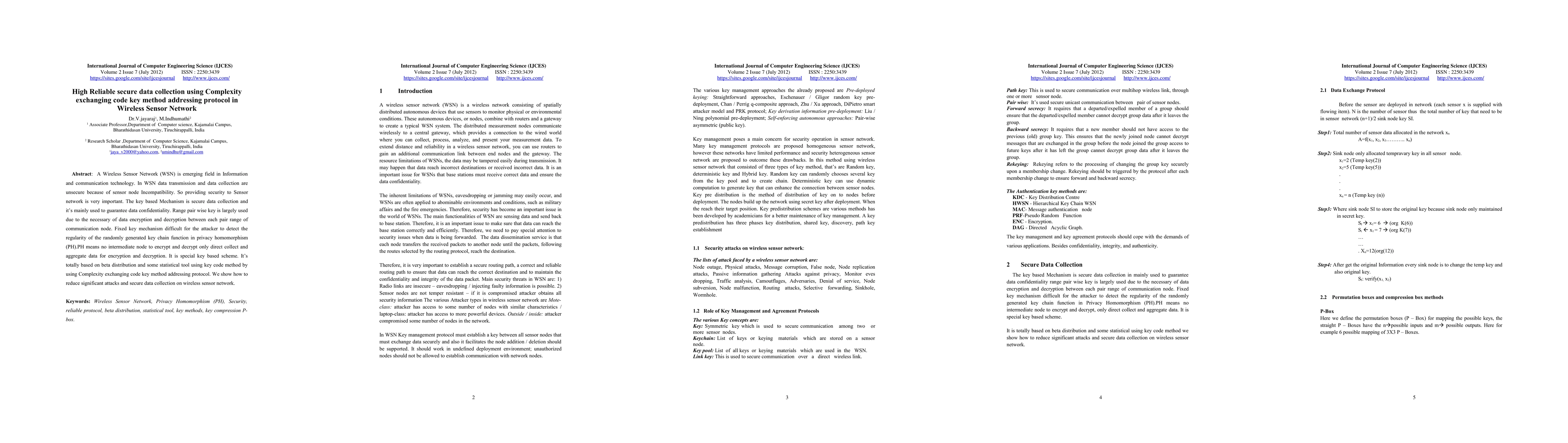 A Wireless Sensor Network (WSN) is emerging field in Information and communication technology. In WSN data transmission and data collection are unsecure because of sensor node Incompatibility. So providing security to Sensor network is very important. The key based Mechanism is secure data collection and it's mainly used to guarantee data confidentiality. Range pair wise key is largely used due to the necessary of data encryption and decryption between each pair range of communication node. Fixed key mechanism difficult for the attacker to detect the regularity of the randomly generated key chain function in privacy homomorphism (PH).PH means no intermediate node to encrypt and decrypt only direct collect and aggregate data for encryption and decryption. It is special key based scheme. It's totally based on beta distribution and some statistical tool using key code method by using Complexity exchanging code key method addressing protocol. We show how to reduce significant attacks and secure data collection on wireless sensor network.