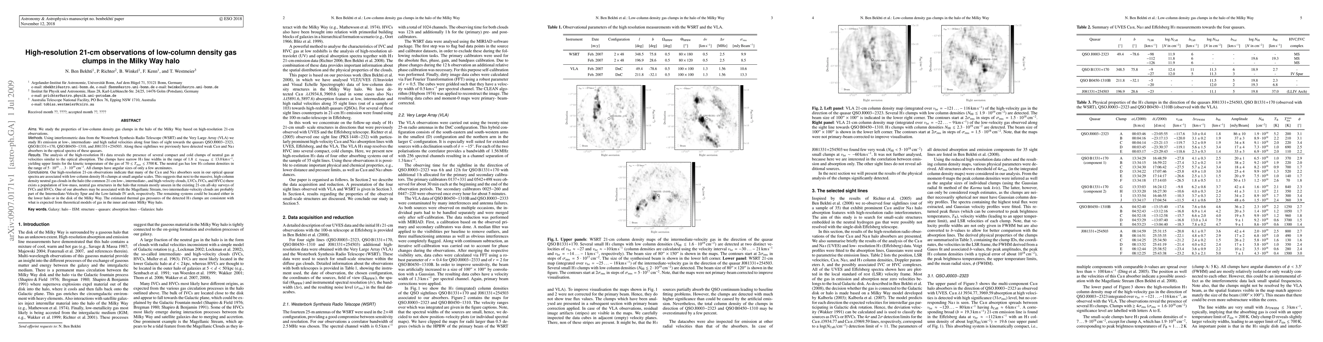 We study the properties of low-column density gas clumps in the halo of the Milky Way based on high-resolution 21-cm observations. Using interferometric data from the WSRT and the VLA we study HI emission at low-, intermediate- and high radial velocities along four lines of sight towards quasars. Along these sightlines we previously detected weak CaII and NaI absorbers in their optical spectra. The analysis of the high-resolution HI data reveals the presence of several compact and cold clumps of neutral gas at velocities similar to the optical absorption. The clumps have narrow HI line widths in the range of 1.8 to 13 km/s, yielding upper limits for the kinetic temperature of the gas of 70 to 3700 K. The neutral gas has low HI column densities in the range of 5E18 to 3E19 1/cm^2. All clumps have angular sizes of only a few arcminutes. Our high-resolution 21-cm observations indicate that many of the CaII and NaI absorbers seen in our optical quasar spectra are associated with low-column density HI clumps at small angular scales. This suggests that next to the massive, high-column density neutral gas clouds in the halo (the common 21-cm LVCs, IVCs, and HVCs) there exists a population of low-mass, neutral gas structures in the halo that remain mostly unseen in the existing 21-cm all-sky surveys of IVCs and HVCs. The estimated thermal gas pressures of the detected HI clumps are consistent with what is expected from theoretical models of gas in the inner and outer Milky Way halo.