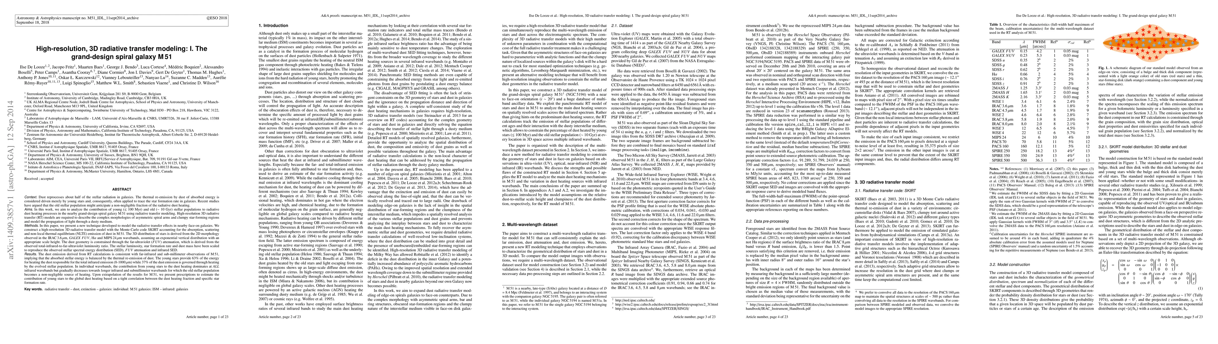 This paper develops a high-resolution 3D radiative transfer model to analyze the contributions of young and old stellar populations to dust heating in the grand-design spiral galaxy M51. The study uses the Monte-Carlo code SKIRT to model the complex light propagation through a dusty medium, revealing that both young and old stars significantly contribute to radiative dust heating.