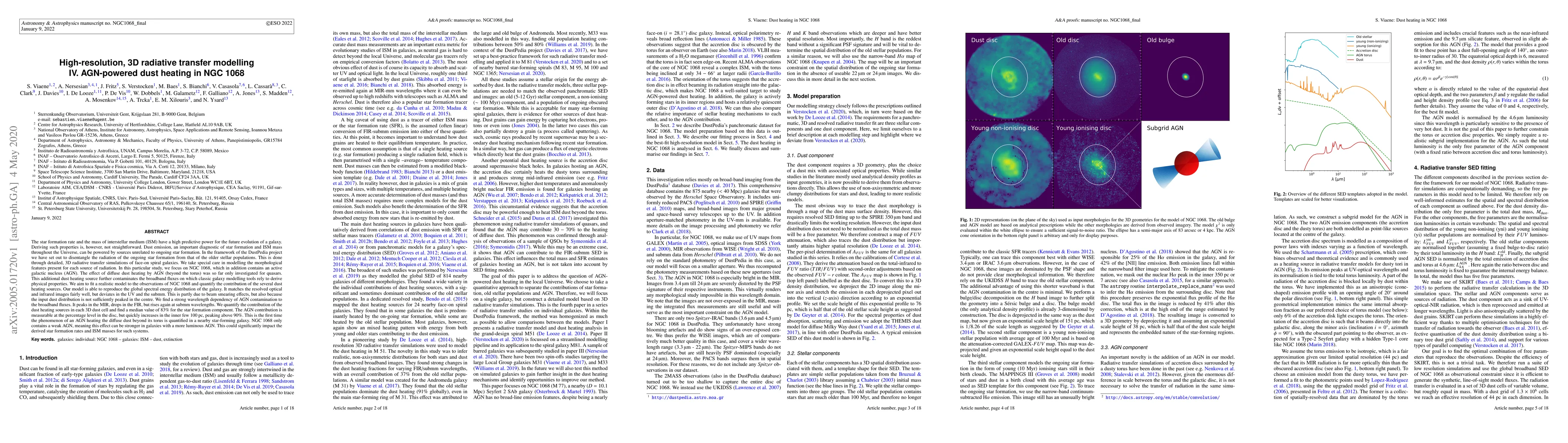 A 3D radiative transfer model simulates dust heating in NGC 1068, a spiral galaxy with an active galactic nucleus, revealing that AGN-powered dust heating is a significant contaminant of broadband fluxes, especially at mid-infrared and submillimeter wavelengths.