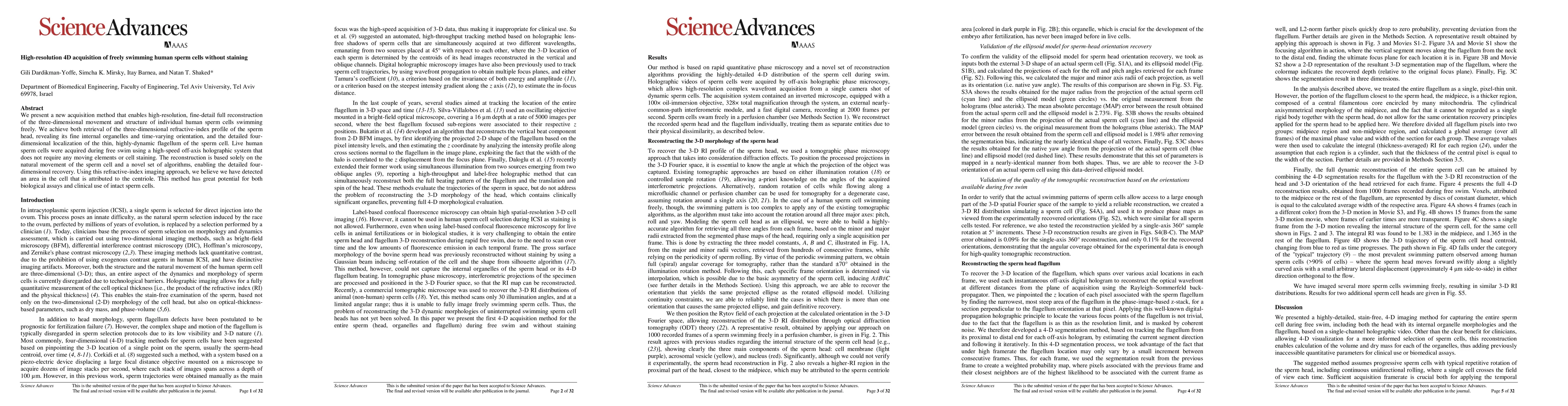 This paper introduces a high-speed off-axis holographic system for capturing high-resolution 4D images of freely swimming human sperm cells without the need for staining. The method enables detailed reconstruction of sperm cell structure and movement, revealing internal organelles and the dynamic flagellum, with potential applications in biological assays and clinical sperm analysis.