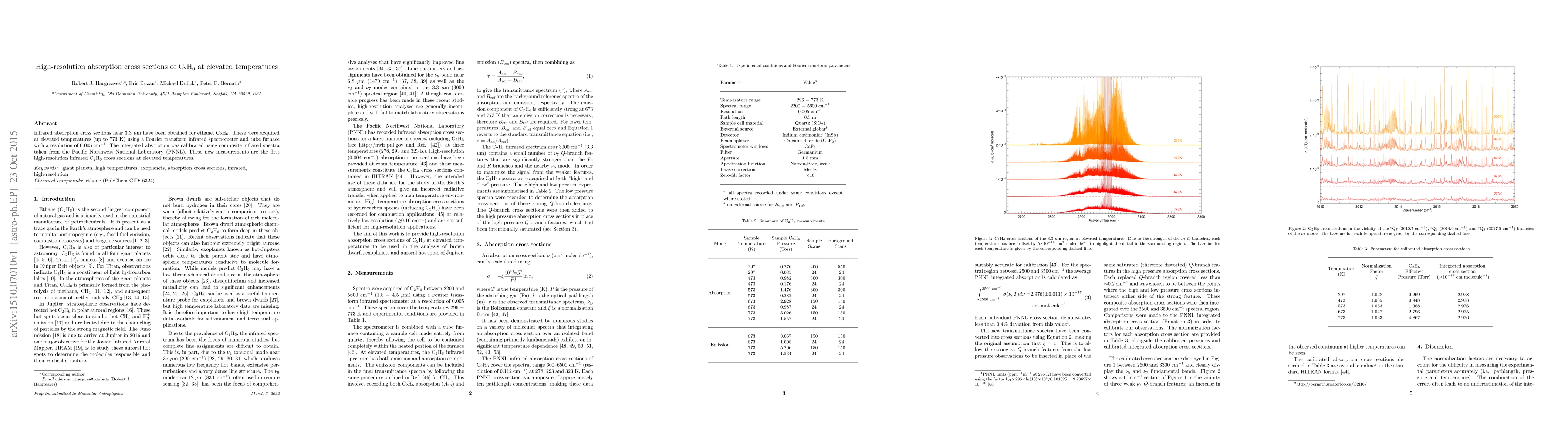 Infrared absorption cross sections near 3.3 $\mu$m have been obtained for ethane, C$_{2}$H$_{6}$. These were acquired at elevated temperatures (up to 773 K) using a Fourier transform infrared spectrometer and tube furnace with a resolution of 0.005 cm$^{-1}$. The integrated absorption was calibrated using composite infrared spectra taken from the Pacific Northwest National Laboratory (PNNL). These new measurements are the first high-resolution infrared C$_{2}$H$_{6}$ cross sections at elevated temperatures.
