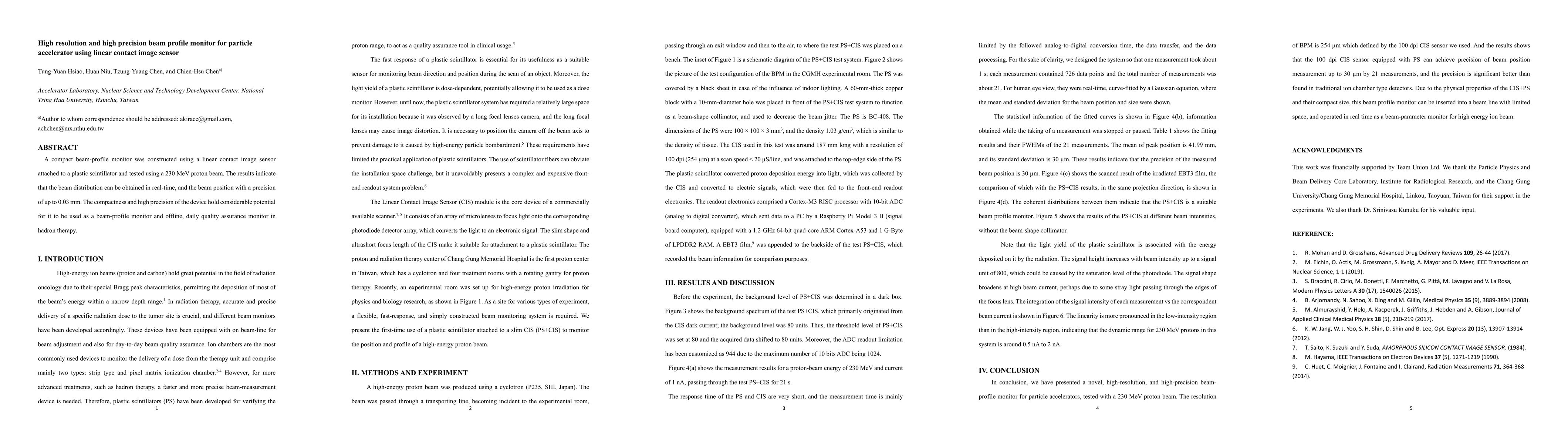A compact beam-profile monitor utilizing a linear contact image sensor and plastic scintillator was developed and tested with a 230 MeV proton beam, achieving real-time distribution and precision up to 0.03 mm, promising for hadron therapy applications.