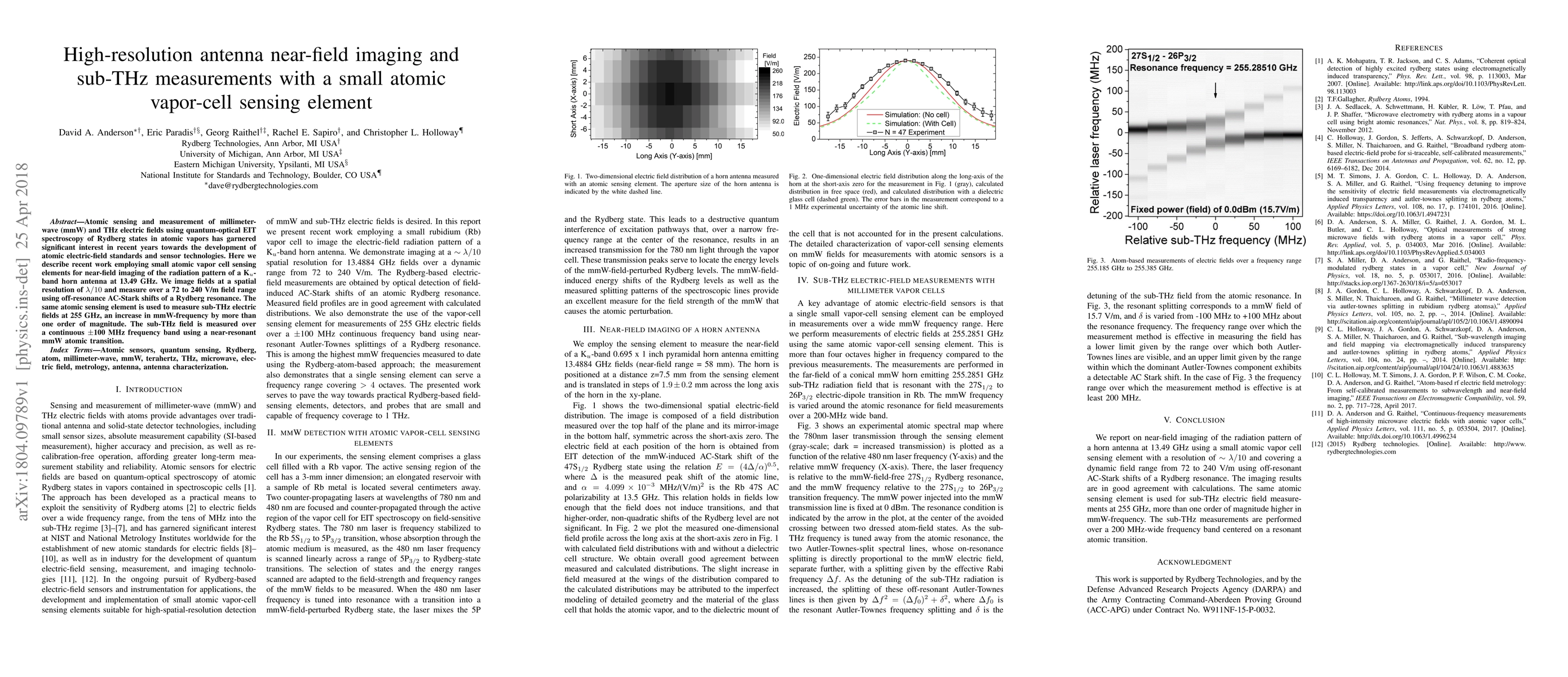 This paper details the use of a small atomic vapor-cell sensor for high-resolution near-field imaging of a K$_u$-band horn antenna at 13.49 GHz and for measuring sub-THz electric fields at 255 GHz, employing quantum-optical EIT spectroscopy of Rydberg states. The sensor achieves a spatial resolution of $\lambda/10$ and measures fields over a range of 72 to 240 V/m.