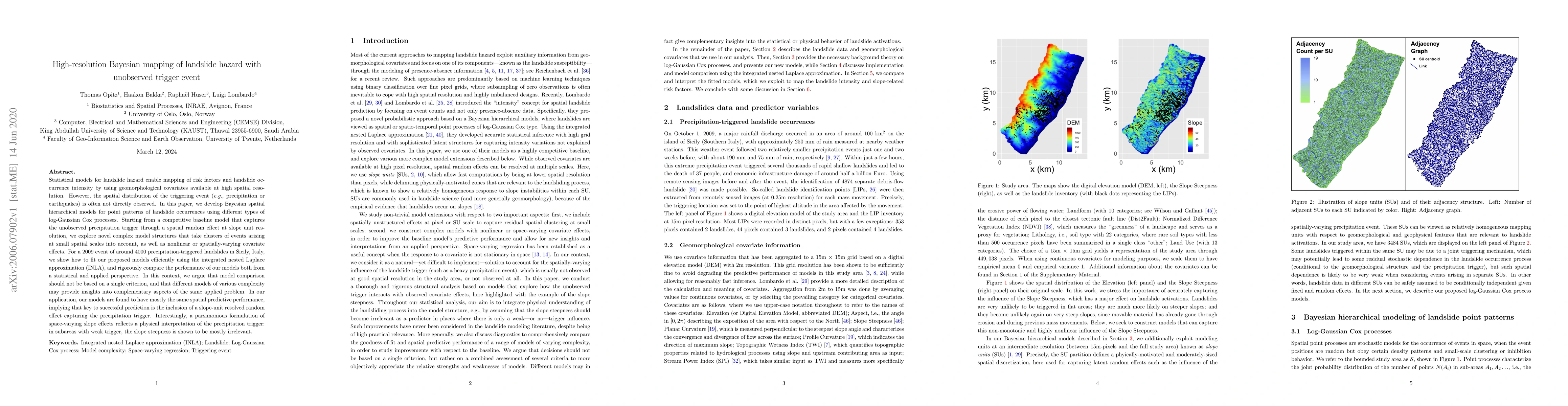 This paper develops Bayesian models to predict landslide hazard based on unobserved trigger events like precipitation or earthquakes. The models show that including a slope-unit resolved random effect capturing the trigger is key to successful prediction, while more complex effects may be less important.