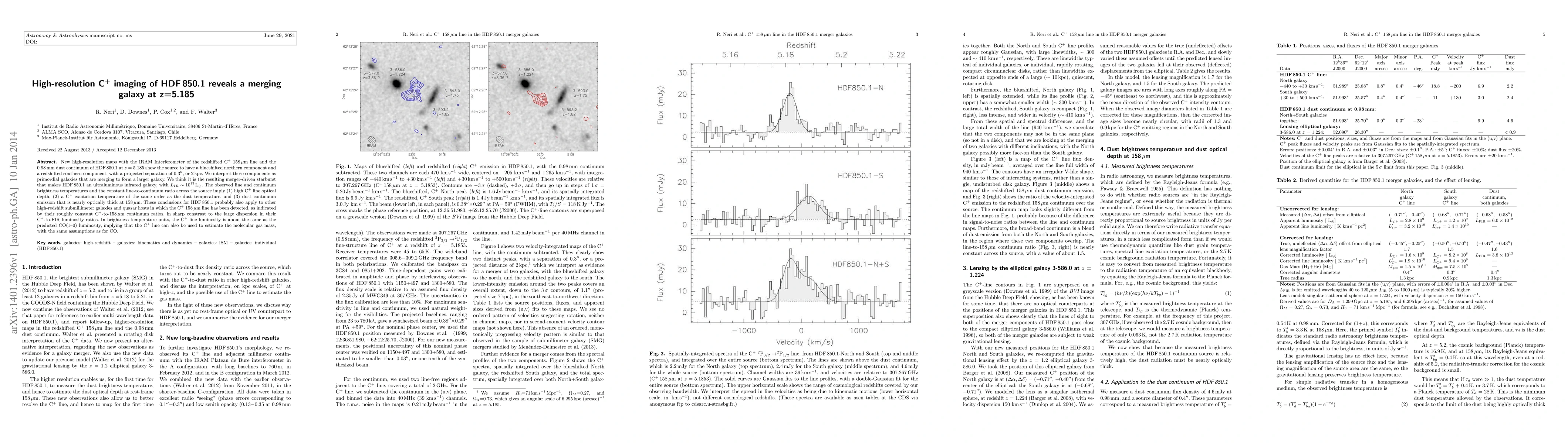 New high-resolution maps with the IRAM Interferometer of the redshifted [C II] 158 micron line and the 0.98mm dust continuum of HDF850.1 at z = 5.185 show the source to have a blueshifted northern component and a redshifted southern component, with a projected separation of 0.3 arcsec, or 2 kpc. We interpret these components as primordial galaxies that are merging to form a larger galaxy. We think it is the resulting merger-driven starburst that makes HDF850.1 an ultraluminous infrared galaxy, with an L(IR) of 1E13 Lsun. The observed line and continuum brightness temperatures and the constant line-to-continuum ratio across the source imply (1) high [C II] line optical depth, (2) a [C II] excitation temperature of the same order as the dust temperature, and (3) dust continuum emission that is nearly optically thick at 158 microns. These conclusions for HDF850.1 probably also apply to other high-redshift submillimeter galaxies and quasar hosts in which the [C II] 158 micron line has been detected, as indicated by their roughly constant [C II]-to-158 micron continuum ratios, in sharp contrast to the large dispersion in their [C II]-to-FIR luminosity ratios. In brightness temperature units, the [C II] line luminosity is about the same as the predicted CO(1-0) luminosity, implying that the [C II] line can also be used to estimate the molecular gas mass, with the same assumptions as for CO.