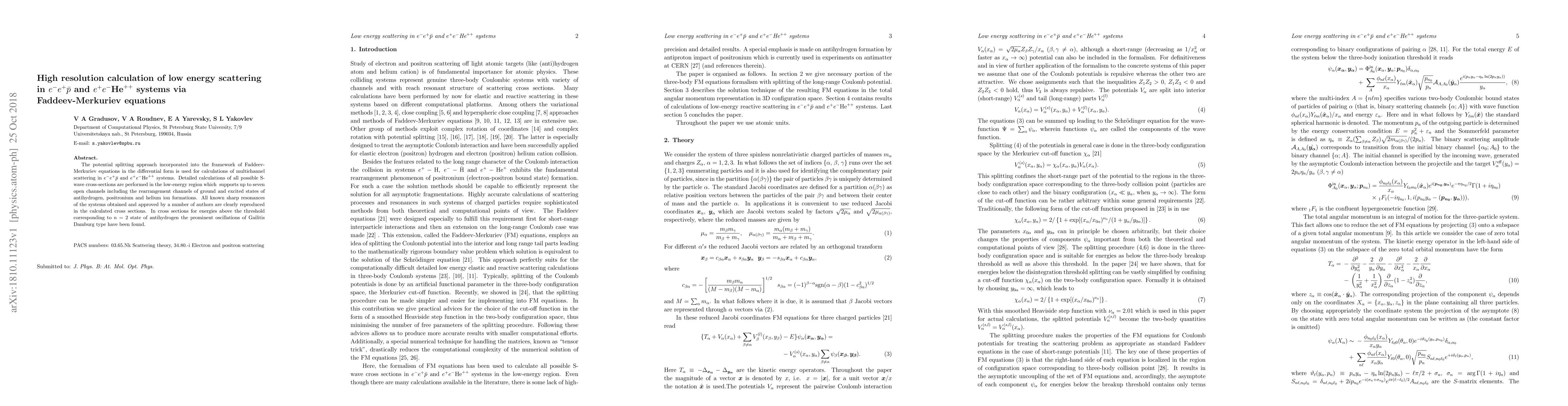 The potential splitting approach incorporated into the framework of Faddeev-Merkuriev equations in the differential form is used for calculations of multichannel scattering in $e^-e^+\bar{p}$ and $e^+e^-\mbox{He}^{++}$ systems. Detailed calculations of all possible S-wave cross-sections are performed %in systems $e^+e^-\bar{p}$ and $e^+e^-\mbox{He}^{++}$ in the low-energy region which supports up to seven open channels including the rearrangement channels of ground and excited states of antihydrogen, positronium and helium ion formations. All known sharp resonances of the systems obtained and approved by a number of authors are clearly reproduced in the calculated cross sections. In cross sections for energies above the threshold corresponding to $n=2$ state of antihydrogen the prominent oscillations of Gailitis Damburg type have been found.