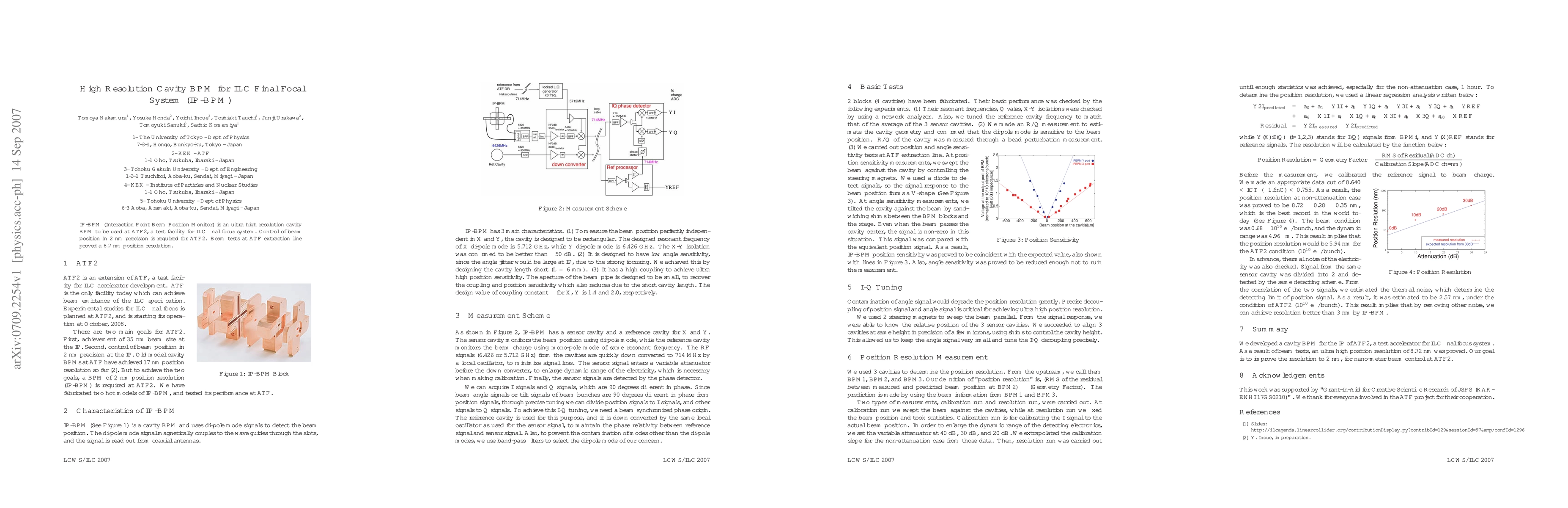 Summary: The IP-BPM is an ultra-high resolution cavity BPM designed for the ATF2 test facility for the ILC final focus system, achieving a beam position control precision of 2 nm. Beam tests demonstrated an 8.7 nm position resolution.