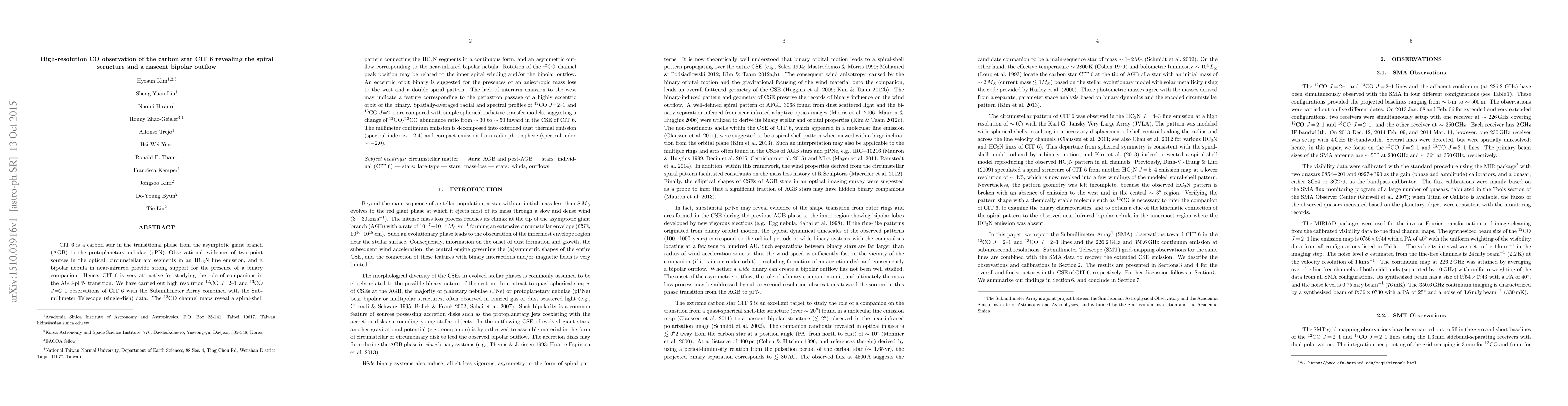 CIT 6 is a carbon star in the transitional phase from the asymptotic giant branch (AGB) to the protoplanetary nebulae (pPN). Observational evidences of two point sources in the optical, circumstellar arc segments in an HC$_3$N line emission, and a bipolar nebula in near-infrared provide strong support for the presence of a binary companion. Hence, CIT 6 is very attractive for studying the role of companions in the AGB-pPN transition. We have carried out high resolution $^{12}$CO $J=2-1$ and $^{13}$CO $J=2-1$ observations of CIT 6 with the Submillimeter Array combined with the Submillimeter Telescope (single-dish) data. The $^{12}$CO channel maps reveal a spiral-shell pattern connecting the HC$_3$N segments in a continuous form, and an asymmetric outflow corresponding to the near-infrared bipolar nebula. Rotation of the $^{12}$CO channel peak position may be related to the inner spiral winding and/or the bipolar outflow. An eccentric orbit binary is suggested for the presences of an anisotropic mass loss to the west and a double spiral pattern. The lack of interarm emission to the west may indicate a feature corresponding to the periastron passage of a highly eccentric orbit of the binary. Spatially-averaged radial and spectral profiles of $^{12}$CO $J=2-1$ and $^{13}$CO $J=2-1$ are compared with simple spherical radiative transfer models, suggesting a change of $^{12}$CO/$^{13}$CO abundance ratio from $\sim30$ to $\sim50$ inward in the CSE of CIT 6. The millimeter continuum emission is decomposed into extended dust thermal emission (spectral index $\sim-2.4$) and compact emission from radio photosphere (spectral index $\sim-2.0$).