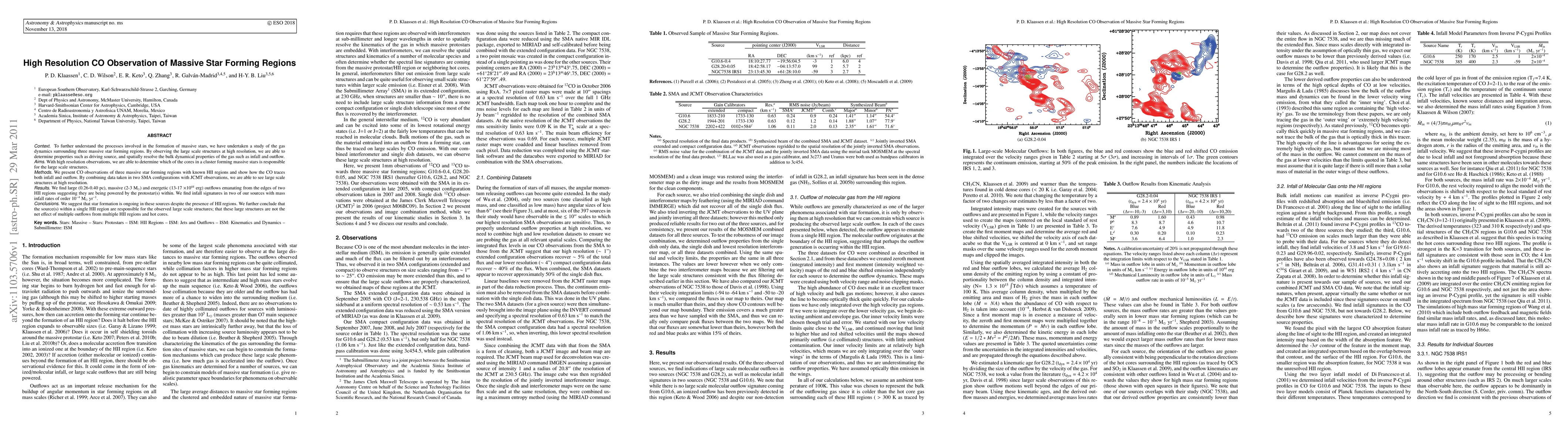Context. To further understand the processes involved in the formation of massive stars, we have undertaken a study of the gas dynamics surrounding three massive star forming regions. By observing the large scale structures at high resolution, we are able to determine properties such as driving source, and spatially resolve the bulk dynamical properties of the gas such as infall and outflow. Aims. With high resolution observations, we are able to determine which of the cores in a cluster forming massive stars is responsible for the large scale structures. Methods. We present CO observations of three massive star forming regions with known HII regions and show how the CO traces both infall and outflow. By combining data taken in two SMA configurations with JCMT observations, we are able to see large scale structures at high resolution. Results. We find large (0.26-0.40 pc), massive (2-3 M_sun) and energetic (13-17 \times 10^44 erg) outflows emanating from the edges of two HII regions suggesting they are being powered by the protostar(s) within. We find infall signatures in two of our sources with mass infall rates of order 10-4 M_sun/yr. Conclusions. We suggest that star formation is ongoing in these sources despite the presence of HII regions. We further conclude that the source(s) within a single HII region are responsible for the observed large scale structures; that these large structures are not the net effect of multiple outflows from multiple HII regions and hot cores.