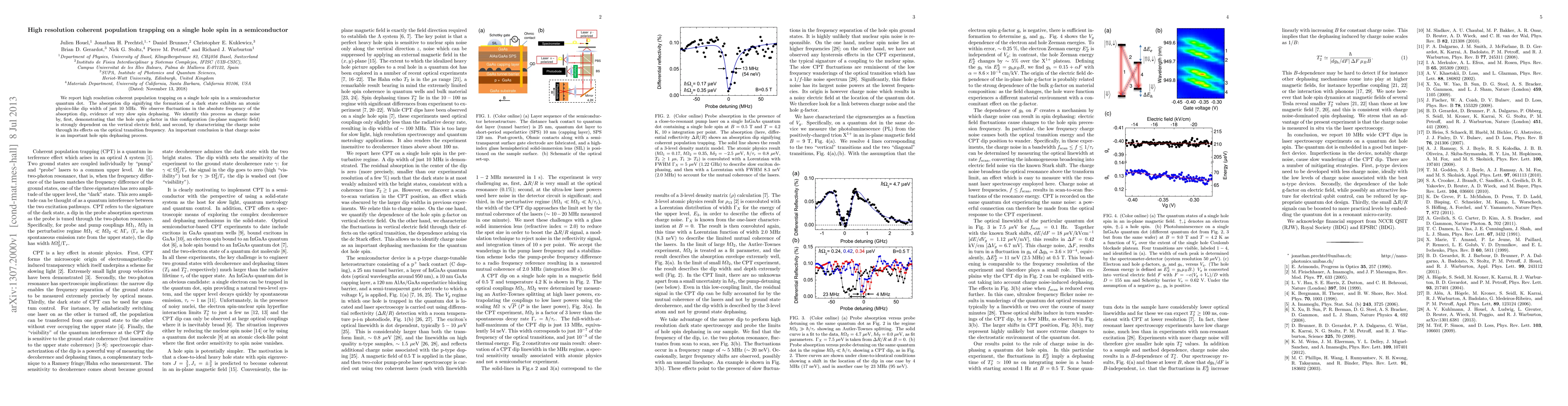 This paper reports high-resolution coherent population trapping on a single hole spin in a semiconductor quantum dot, achieving a narrow absorption dip width of 10 MHz indicative of a dark state. The study identifies charge noise as a significant factor in hole spin dephasing, evidenced by the dependence of the hole spin g-factor on vertical electric field and its effects on the optical transition frequency.