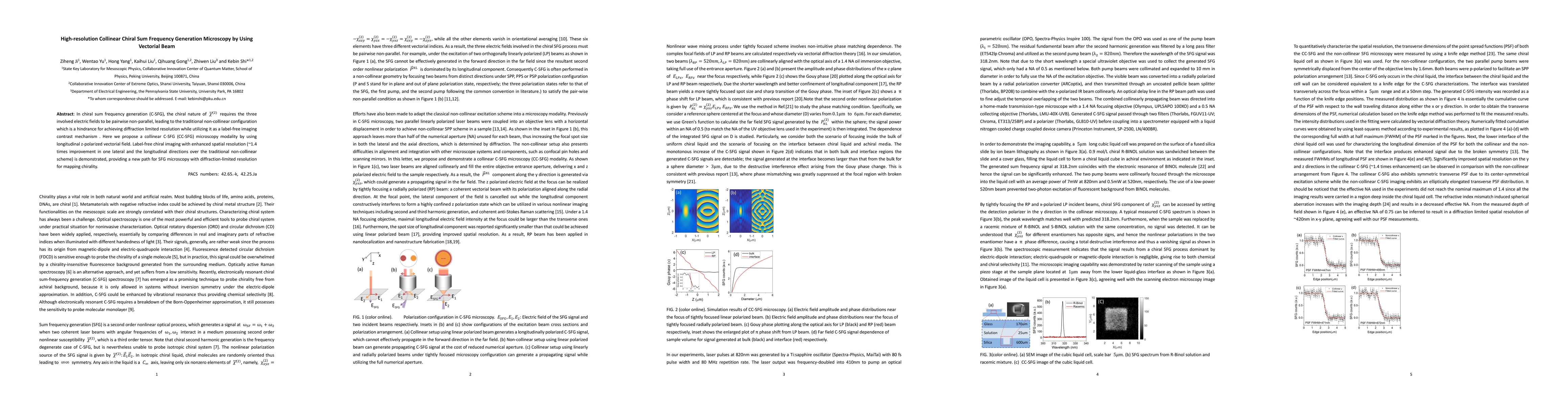 This paper proposes a collinear chiral sum frequency generation (CC-SFG) microscopy using vectorial beams, achieving enhanced spatial resolution (~1.4 times improvement) compared to traditional non-collinear methods, enabling label-free chiral imaging with diffraction-limited resolution.