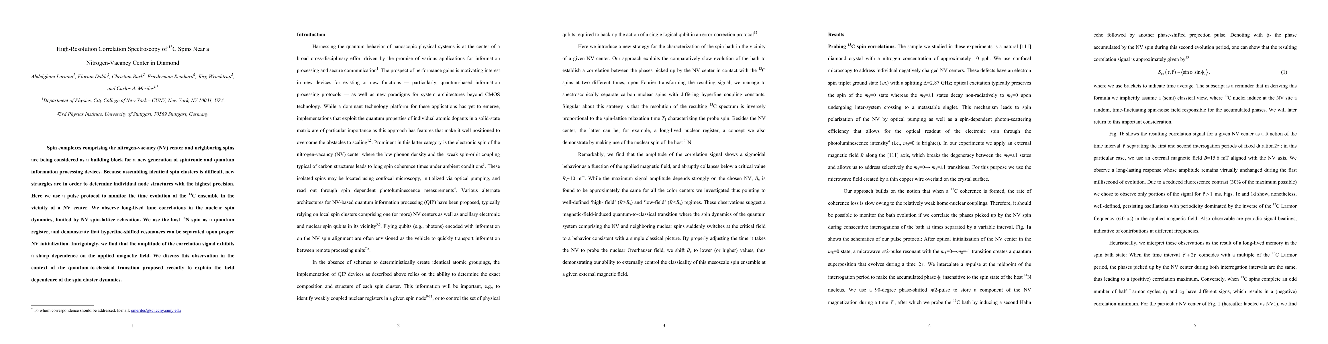 Spin complexes comprising the nitrogen-vacancy (NV) center and neighboring spins are being considered as a building block for a new generation of spintronic and quantum information processing devices. Because assembling identical spin clusters is difficult, new strategies are in order to determine individual node structures with the highest precision. Here we use a pulse protocol to monitor the time evolution of the 13C ensemble in the vicinity of a NV center. We observe long-lived time correlations in the nuclear spin dynamics, limited by NV spin-lattice relaxation. We use the host 14N spin as a quantum register, and demonstrate that hyperfine-shifted resonances can be separated upon proper NV initialization. Intriguingly, we find that the amplitude of the correlation signal exhibits a sharp dependence on the applied magnetic field. We discuss this observation in the context of the quantum-to-classical transition proposed recently to explain the field dependence of the spin cluster dynamics.