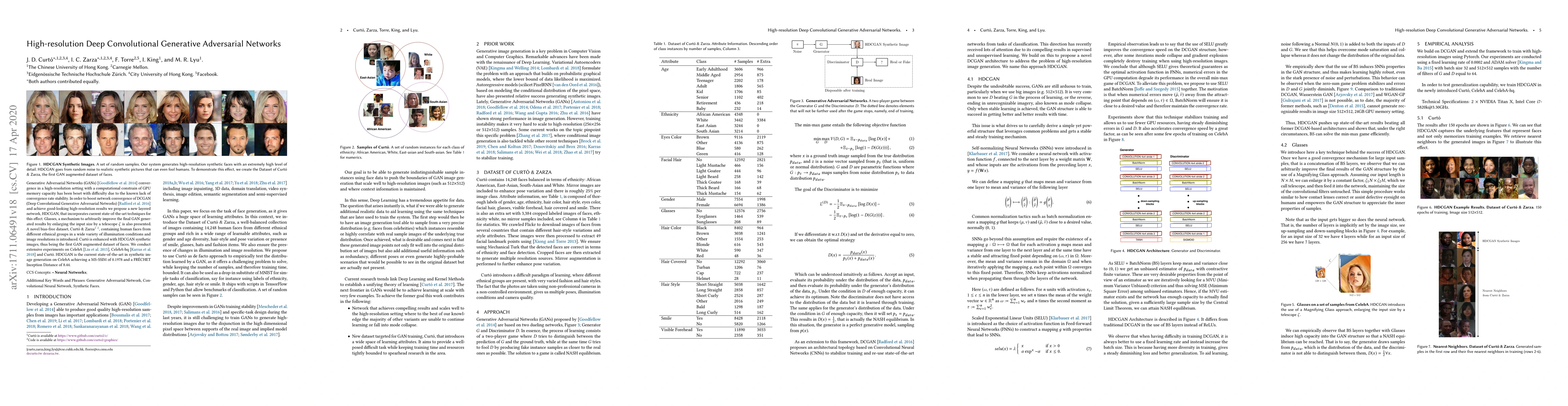 This paper proposes HDCGAN, a new layered network to enhance the convergence and quality of high-resolution Deep Convolutional Generative Adversarial Networks (DCGANs). It introduces Glasses, a mechanism to enlarge input size for better results, and augments the Curtó dataset with synthetic images, making it the first GAN augmented dataset of faces. HDCGAN achieves state-of-the-art results on CelebA-hq.
