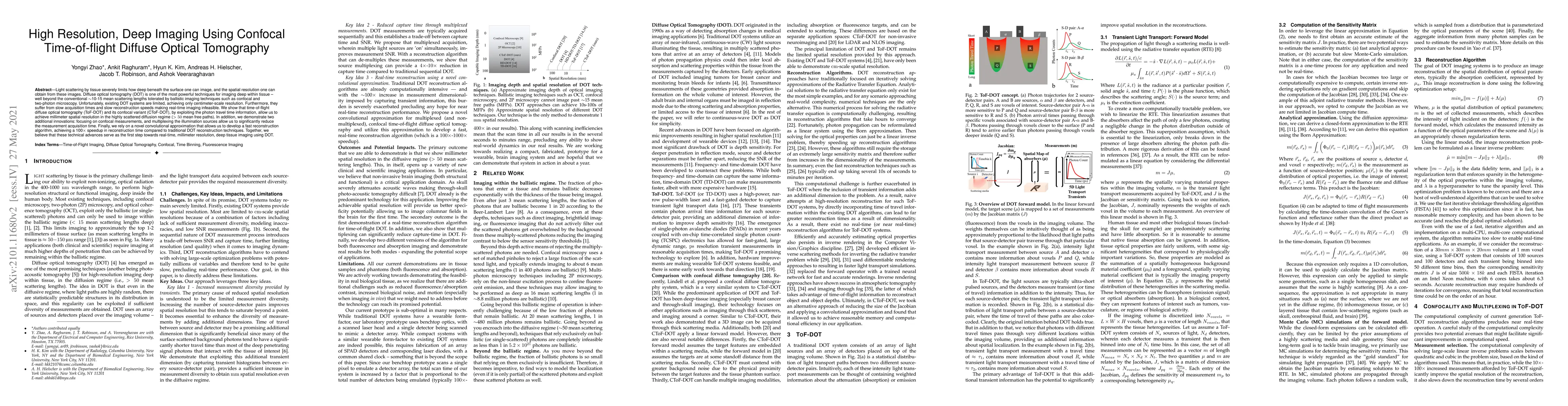 This paper presents a novel confocal time-of-flight diffuse optical tomography (CToF-DOT) technique that achieves millimeter spatial resolution and significantly reduces acquisition time and reconstruction speed, marking a significant step towards real-time deep tissue imaging. The method leverages photon travel time information and a fast reconstruction algorithm for improved imaging in highly scattered tissue.