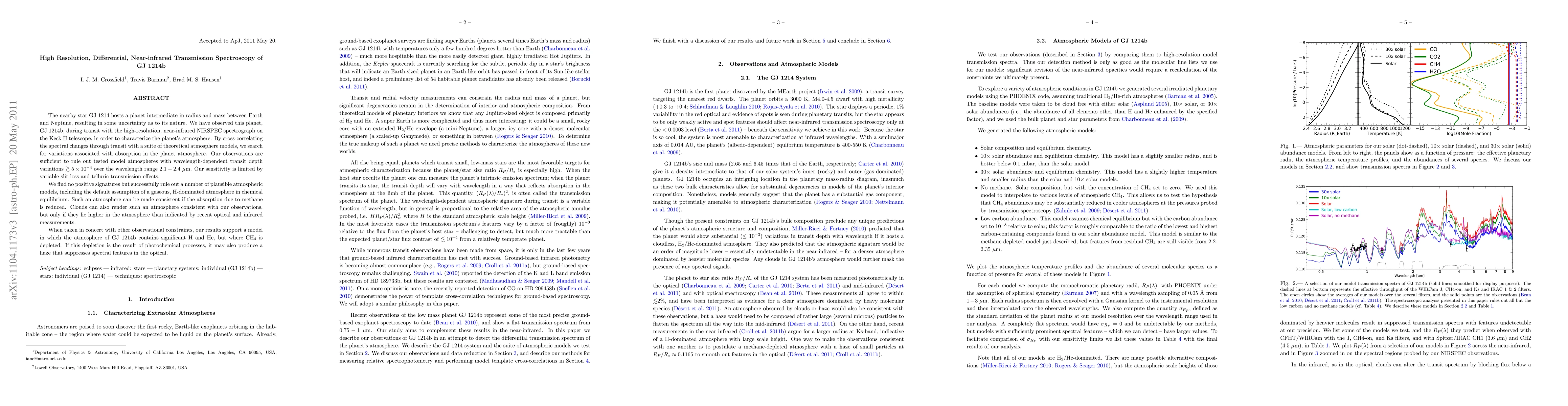 This study uses high-resolution near-infrared spectroscopy to analyze the atmosphere of GJ 1214b, finding no positive atmospheric absorption signatures but ruling out several plausible models, including a gaseous, hydrogen-dominated atmosphere. The results support a model with significant hydrogen and helium but depleted methane, potentially leading to haze formation.