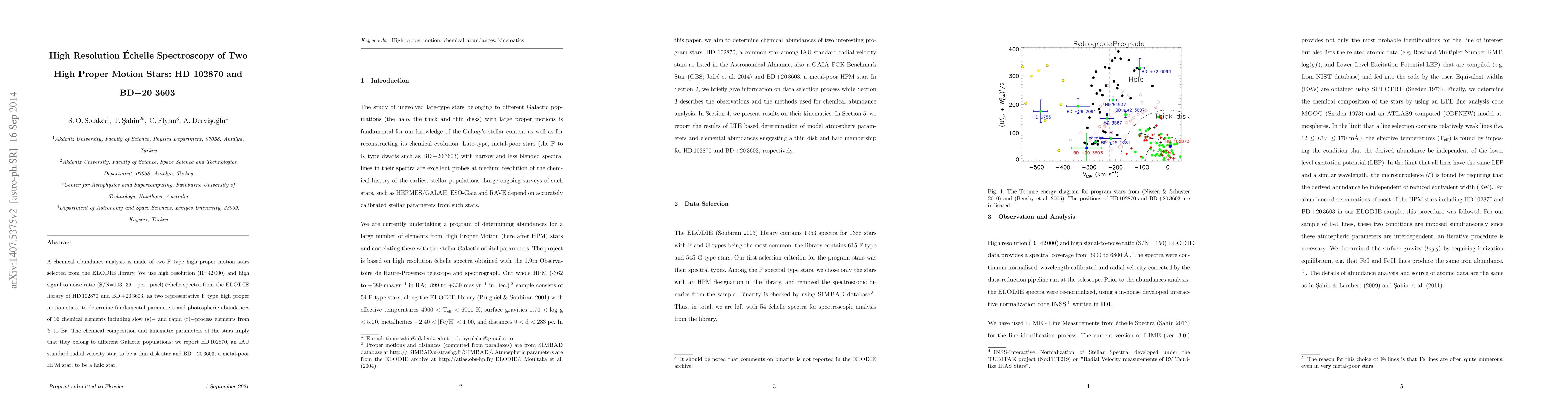 A chemical abundance analysis is made of two F type high proper motion stars selected from the {\sc ELODIE} library. We use high resolution (R=42\,000) and high signal to noise ratio (S/N=103, 36 $-$per$-$pixel) \'echelle spectra from the {\sc ELODIE} library of HD\,102870 and BD\,+20\,3603, as two representative F type high proper motion stars, to determine fundamental parameters and photospheric abundances of 16 chemical elements including slow (s)$-$ and rapid (r)$-$process elements from Y to Ba. The chemical composition and kinematic parameters of the stars imply that they belong to different Galactic populations: we report HD\,102870, an IAU standard radial velocity star, to be a thin disk star and BD\,+20\,3603, a metal-poor HPM star, to be a halo star.