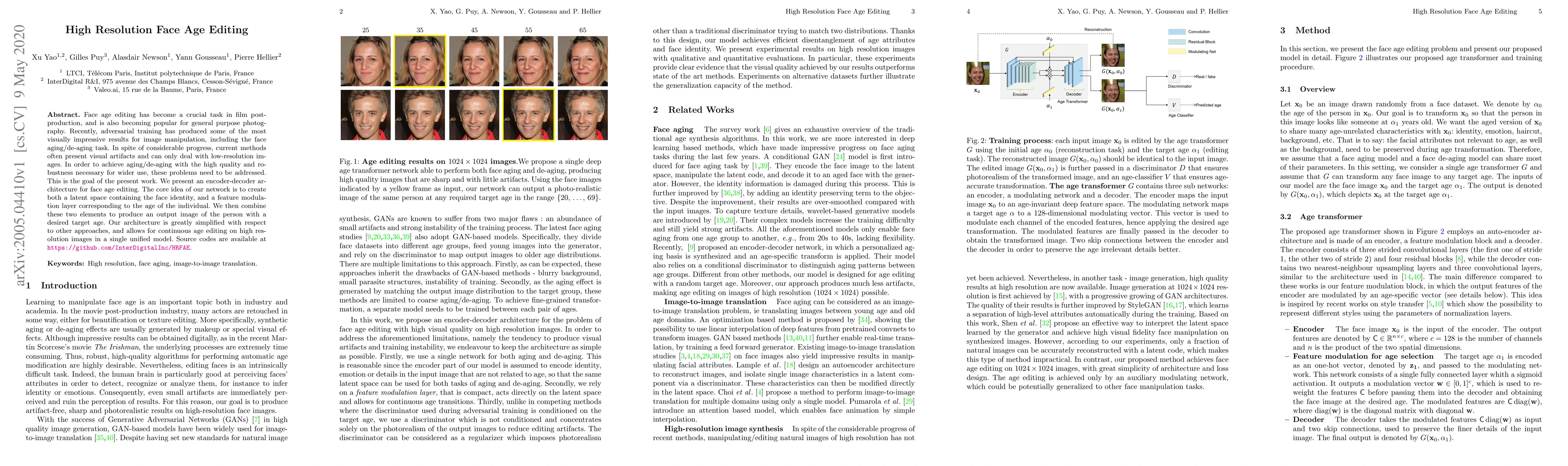 This paper proposes an encoder-decoder architecture for high-resolution face age editing, utilizing a latent space for identity and a feature modulation layer for age, enabling continuous age manipulation on high-resolution images with fewer artifacts compared to existing methods.