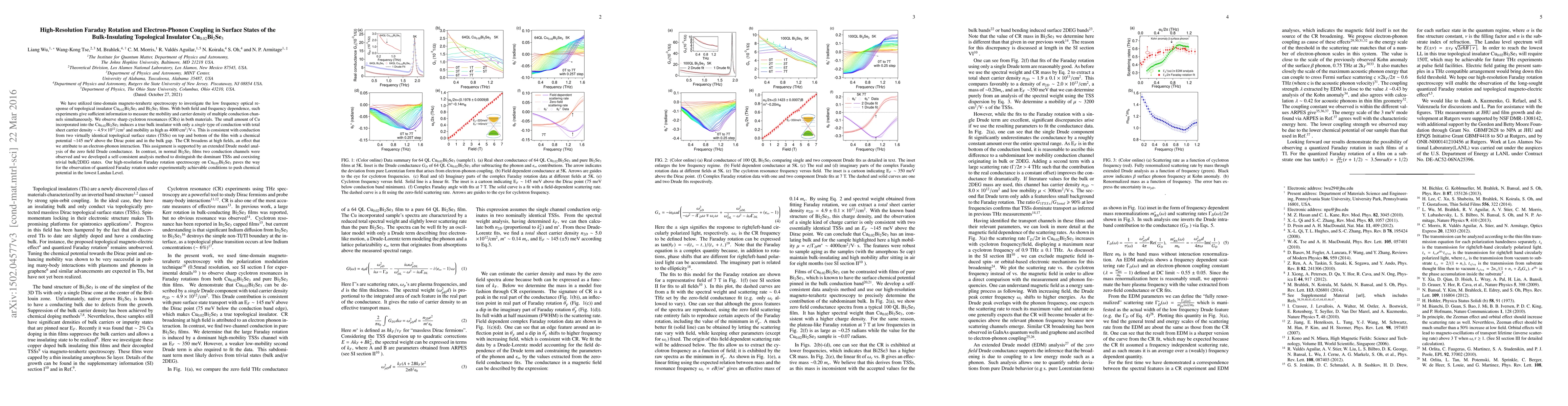 Researchers studied topological insulator Cu0.02Bi2Se3 using time-domain magneto-terahertz spectroscopy to observe cyclotron resonances and electron-phonon coupling effects, revealing high carrier mobility and quantized Faraday rotation in the material.