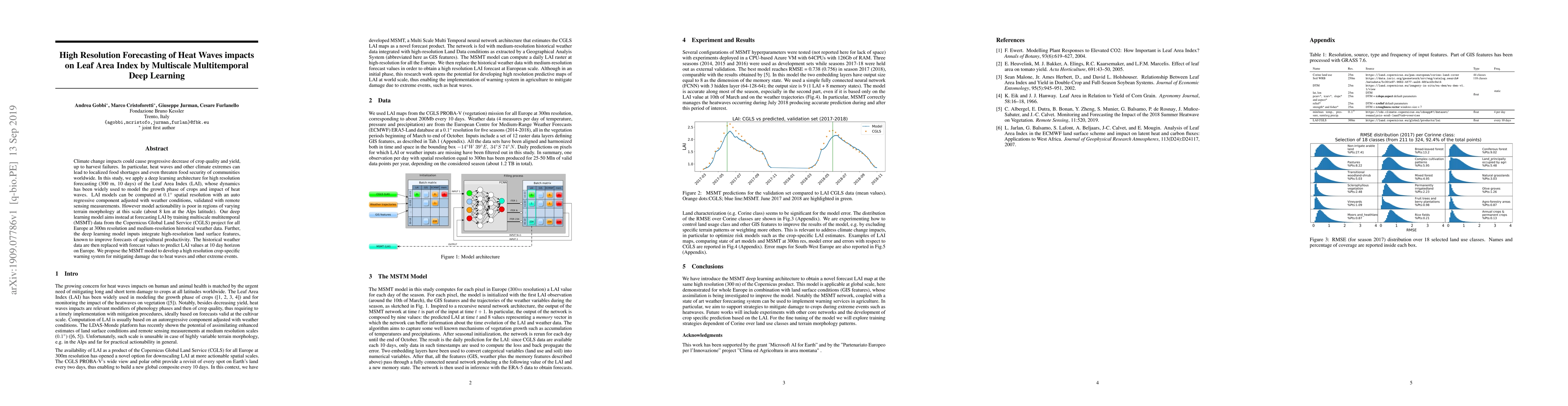 Climate change impacts could cause progressive decrease of crop quality and yield, up to harvest failures. In particular, heat waves and other climate extremes can lead to localized food shortages and even threaten food security of communities worldwide. In this study, we apply a deep learning architecture for high resolution forecasting (300 m, 10 days) of the Leaf Area Index (LAI), whose dynamics has been widely used to model the growth phase of crops and impact of heat waves. LAI models can be computed at 0.1 degree spatial resolution with an auto regressive component adjusted with weather conditions, validated with remote sensing measurements. However model actionability is poor in regions of varying terrain morphology at this scale (about 8 km at the Alps latitude). Our deep learning model aims instead at forecasting LAI by training multiscale multitemporal (MSMT) data from the Copernicus Global Land Service (CGLS) project for all Europe at 300m resolution and medium-resolution historical weather data. Further, the deep learning model inputs integrate high-resolution land surface features, known to improve forecasts of agricultural productivity. The historical weather data are then replaced with forecast values to predict LAI values at 10 day horizon on Europe. We propose the MSMT model to develop a high resolution crop-specific warning system for mitigating damage due to heat waves and other extreme events.