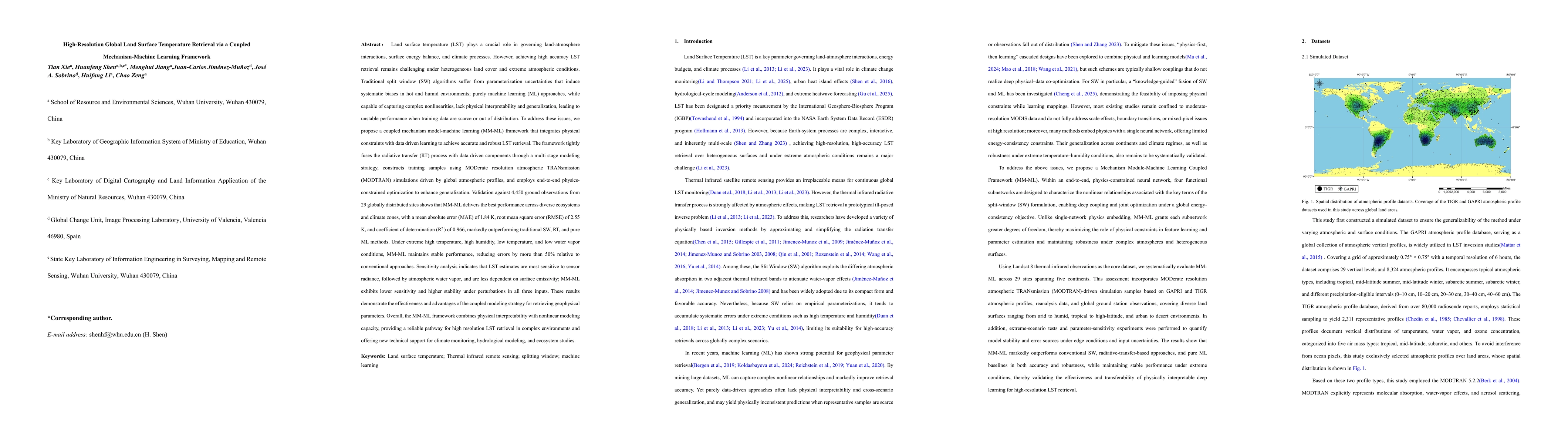 Land surface temperature (LST) is vital for land-atmosphere interactions and climate processes. Accurate LST retrieval remains challenging under heterogeneous land cover and extreme atmospheric conditions. Traditional split window (SW) algorithms show biases in humid environments; purely machine learning (ML) methods lack interpretability and generalize poorly with limited data. We propose a coupled mechanism model-ML (MM-ML) framework integrating physical constraints with data-driven learning for robust LST retrieval. Our approach fuses radiative transfer modeling with data components, uses MODTRAN simulations with global atmospheric profiles, and employs physics-constrained optimization. Validation against 4,450 observations from 29 global sites shows MM-ML achieves MAE=1.84K, RMSE=2.55K, and R-squared=0.966, outperforming conventional methods. Under extreme conditions, MM-ML reduces errors by over 50%. Sensitivity analysis indicates LST estimates are most sensitive to sensor radiance, then water vapor, and less to emissivity, with MM-ML showing superior stability. These results demonstrate the effectiveness of our coupled modeling strategy for retrieving geophysical parameters. The MM-ML framework combines physical interpretability with nonlinear modeling capacity, enabling reliable LST retrieval in complex environments and supporting climate monitoring and ecosystem studies.