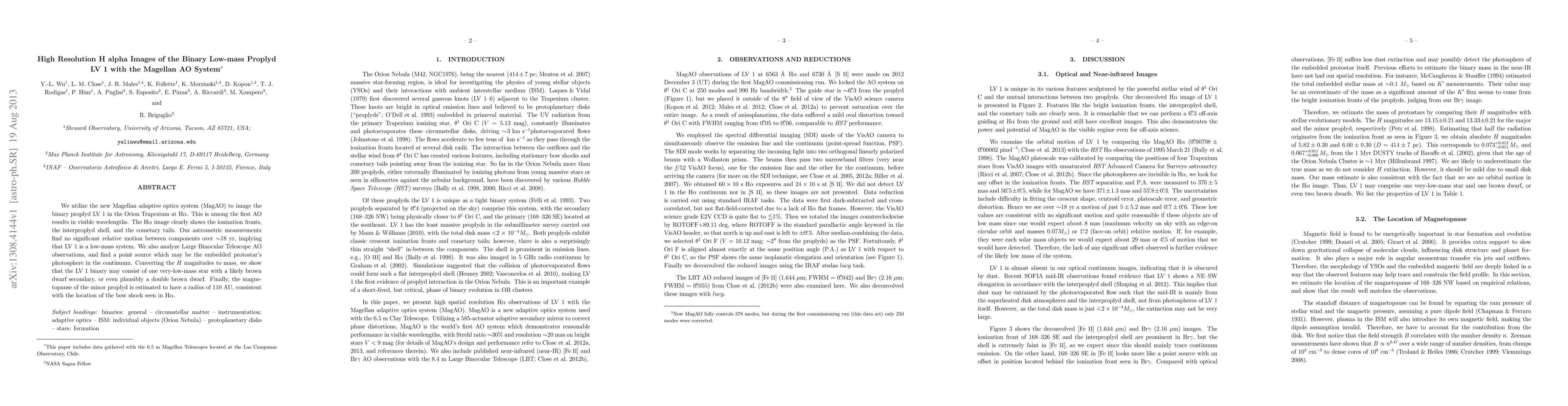This study uses the Magellan AO system to capture high-resolution H alpha images of the binary proplyd LV 1 in Orion Trapezium, revealing ionization fronts and cometary tails. The analysis suggests LV 1 is a stable low-mass system with no significant relative motion over 18 years, potentially consisting of a very-low-mass star and a brown dwarf or possibly two brown dwarfs.