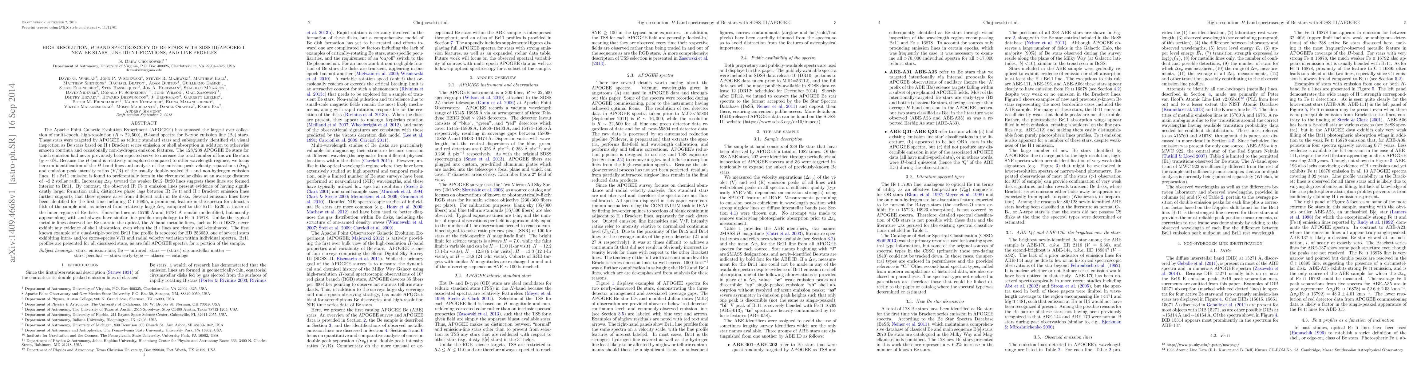 The APOGEE survey has discovered 128 new Be stars and analyzed their H-band spectra, identifying new lines and characterizing existing ones. The study finds that H I Br11 forms at ~2.2 stellar radii, while IR Fe II lines originate from larger radii in Be disks, evidenced by distinct phase lags. Newly identified lines, like ~16895, indicate inner disk regions. Uniquely, H-band metallic lines lack shell absorption, contrasting with optical metallic lines. The research also reports quasi-triple-peaked Br11 line profiles, showcasing intra- and extra-species variation within individual spectra.