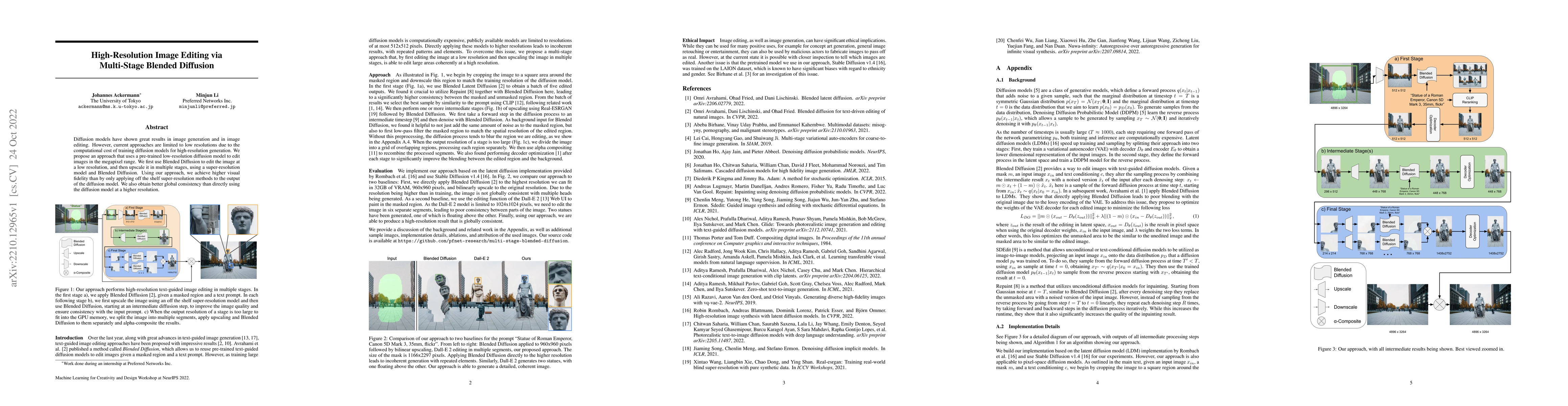This paper proposes a multi-stage blended diffusion method for high-resolution image editing, leveraging a pre-trained low-resolution diffusion model followed by super-resolution and further diffusion refinement to achieve higher visual fidelity and better global consistency compared to direct high-resolution diffusion modeling or standalone super-resolution methods.