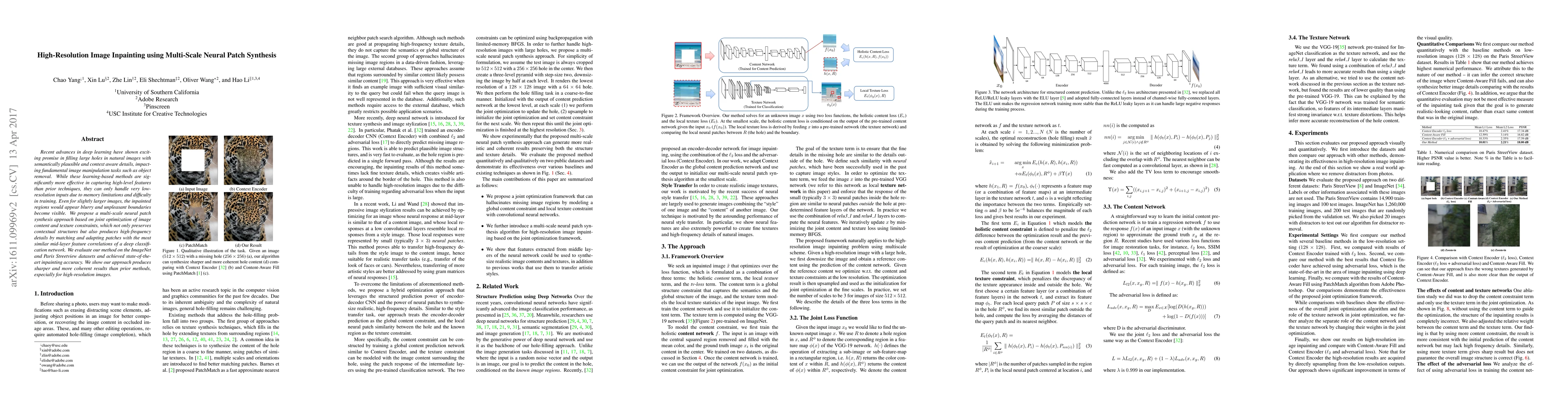This paper proposes a multi-scale neural patch synthesis method for high-resolution image inpainting, achieving state-of-the-art accuracy by optimizing both image content and texture constraints. The approach produces sharper and more coherent results compared to prior methods, especially for large images.