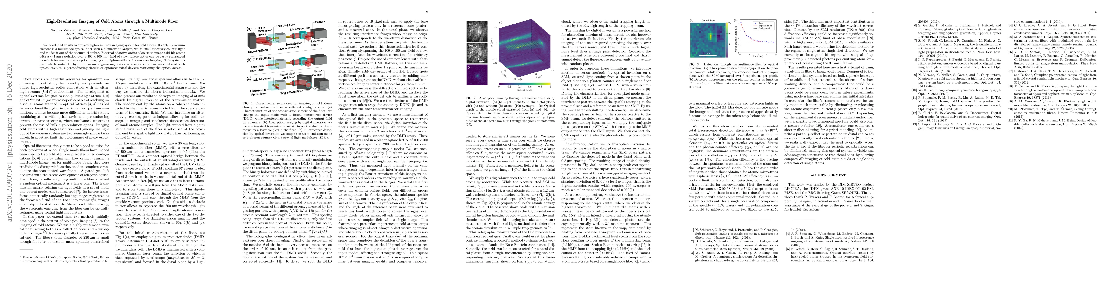 This paper presents a compact high-resolution imaging system for cold atoms using a multimode fiber in a vacuum, achieving $\sim 1\,\mu$m resolution over a $100 \times 100\,\mu$m$^2$ area. The system employs adaptive optics for switching between fast imaging modes and is ideal for quantum engineering applications.