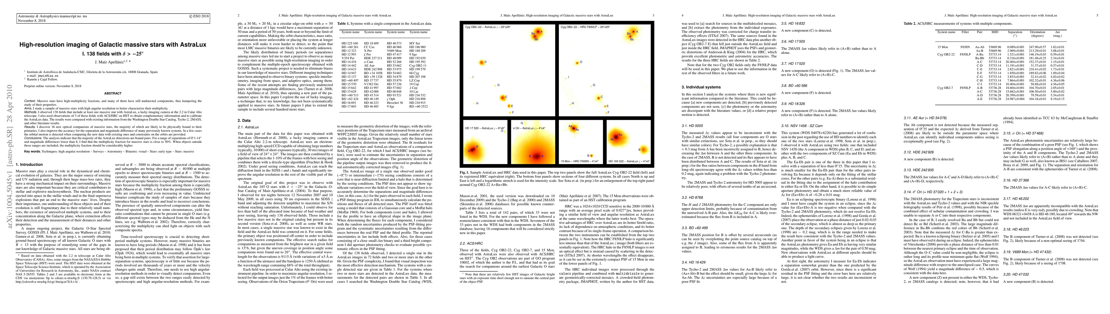 CONTEXT. Massive stars have high-multiplicity fractions, and many of them have still undetected components, thus hampering the study of their properties. AIMS. I study a sample of massive stars with high angular resolution to better characterize their multiplicity. METHODS. I observed 138 fields that include at least one massive star with AstraLux, a lucky imaging camera at the 2.2 m Calar Alto telescope. I also used observations of 3 of those fields with ACS/HRC on HST to obtain complementary information and to calibrate the AstraLux data. The results were compared with existing information from the Washington Double Star Catalog, Tycho-2, 2MASS, and other literature results. RESULTS. I discover 16 new optical companions of massive stars, the majority of which are likely to be physically bound to their primaries. I also improve the accuracy for the separation and magnitude difference of many previously known systems. In a few cases the orbital motion is detected when comparing the new data with existing ones and constraints on the orbits are provided. CONCLUSIONS. The analysis indicate that the majority of the AstraLux detections are bound pairs. For a range of separations of 0.1"-14" and magnitude differences lower than 8, I find that the multiplicity fraction for massive stars is close to 50%. When objects outside those ranges are included, the multiplicity fraction should be considerably higher.