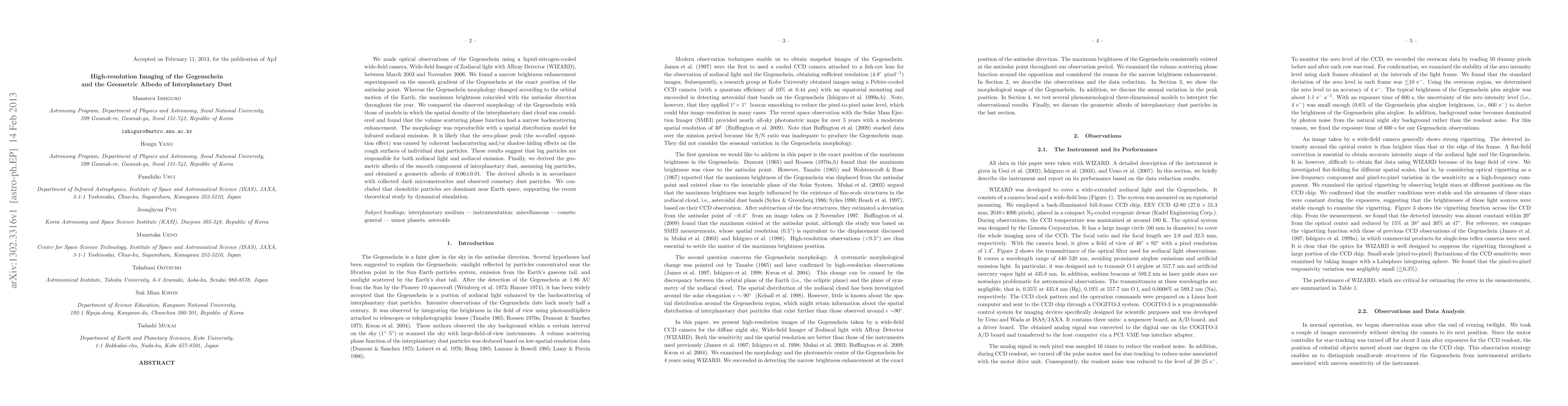 We made optical observations of the Gegenschein using a liquid-nitrogen-cooled wide-field camera, Wide-field Imager of Zodiacal light with ARray Detector (WIZARD), between March 2003 and November 2006. We found a narrow brightness enhancement superimposed on the smooth gradient of the Gegenschein at the exact position of the antisolar point. Whereas the Gegenschein morphology changed according to the orbital motion of the Earth, the maximum brightness coincided with the antisolar direction throughout the year. We compared the observed morphology of the Gegenschein with those of models in which the spatial density of the interplanetary dust cloud was considered and found that the volume scattering phase function had a narrow backscattering enhancement. The morphology was reproducible with a spatial distribution model for infrared zodiacal emission. It is likely that the zero-phase peak (the so-called opposition effect) was caused by coherent backscattering and/or shadow-hiding effects on the rough surfaces of individual dust particles. These results suggest that big particles are responsible for both zodiacal light and zodiacal emission. Finally, we derived the geometric albedo of the smooth component of interplanetary dust, assuming big particles, and obtained a geometric albedo of 0.06+-0.01. The derived albedo is in accordance with collected dark micrometeorites and observed cometary dust particles. We concluded that chondritic particles are dominant near Earth space, supporting the recent theoretical study by dynamical simulation.