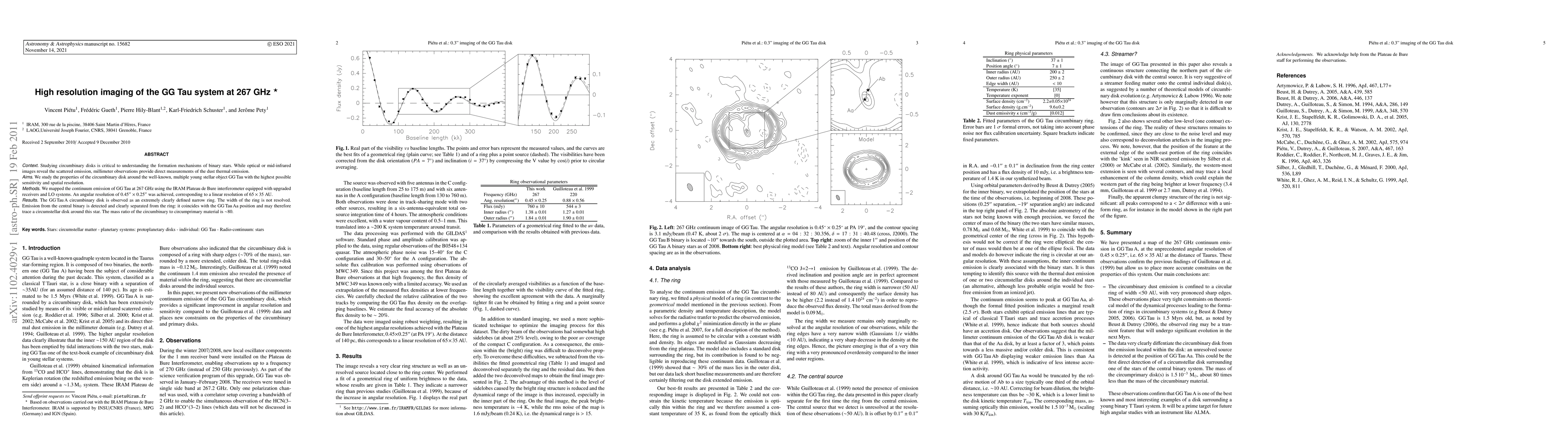 Studying circumbinary disks is critical to understanding the formation mechanisms of binary stars. While optical or mid-infrared images reveal the scattered mission, millimeter observations provide direct measurements of the dust thermal emission. We study the properties of the circumbinary disk around the well-known, multiple young stellar object GG Tau with the highest possible sensitivity and spatial resolution. We mapped the continuum emission of GG Tau at 267 GHz using the IRAM Plateau de Bure interferometer equipped with upgraded receivers and LO systems. An angular resolution of 0.45"x0.25" was achieved, corresponding to a linear resolution of 65x35 AU. The GG Tau A circumbinary disk is observed as an extremely clearly defined narrow ring. The width of the ring is not resolved. Emission from the central binary is detected and clearly separated from the ring: it coincides with the GG Tau Aa position and may therefore trace a circumstellar disk around this star. The mass ratio of the circumbinary to circumprimary material is ~80.