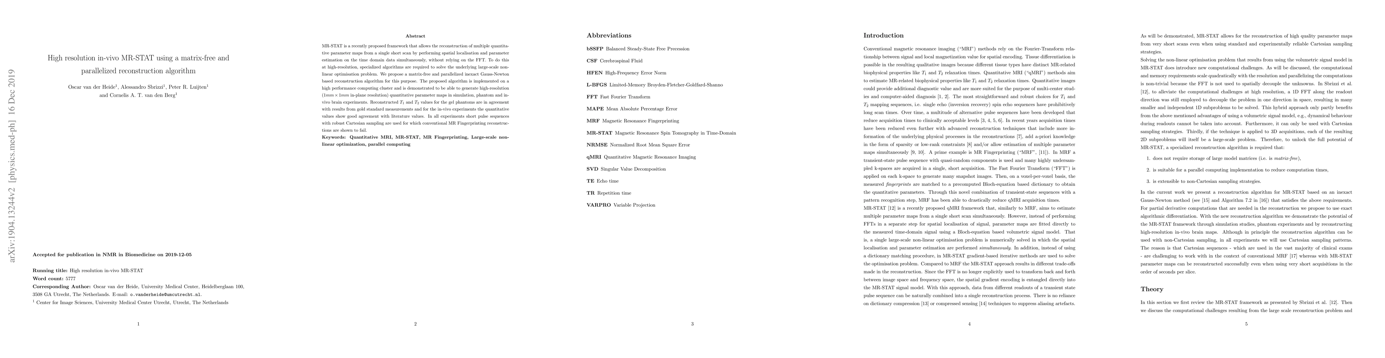 This paper proposes a matrix-free and parallelized reconstruction algorithm for high-resolution MR-STAT, enabling simultaneous spatial localization and parameter estimation without FFT. The algorithm achieves $1mm \times 1mm$ in-plane resolution and demonstrates accurate $T_1$ and $T_2$ mapping in phantom and in-vivo brain experiments.
