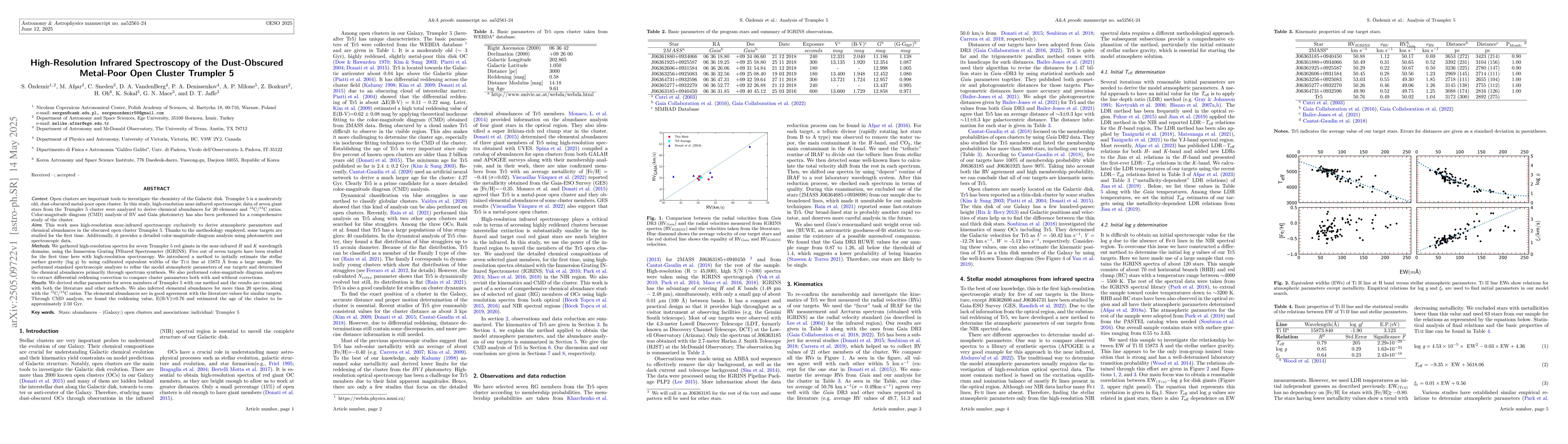 This research provides detailed chemical composition and stellar parameters of metal-poor, dust-obscured open cluster Trumpler 5, contributing to our understanding of low-metallicity star clusters and their evolution.