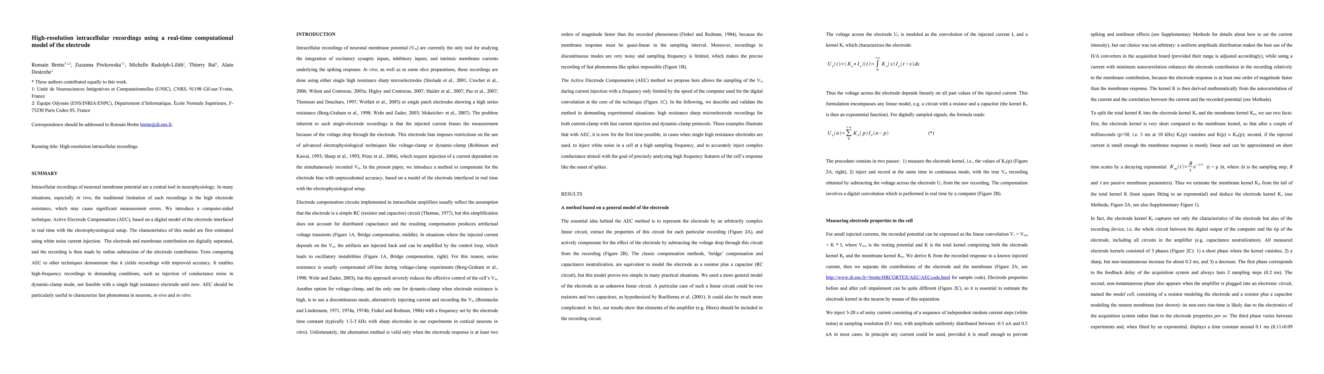 This paper introduces Active Electrode Compensation (AEC), a computer-aided technique that uses a real-time computational model of the electrode to improve the accuracy of high-resolution intracellular recordings. AEC separates the electrode and membrane contributions digitally, enabling high-frequency recordings in challenging conditions.