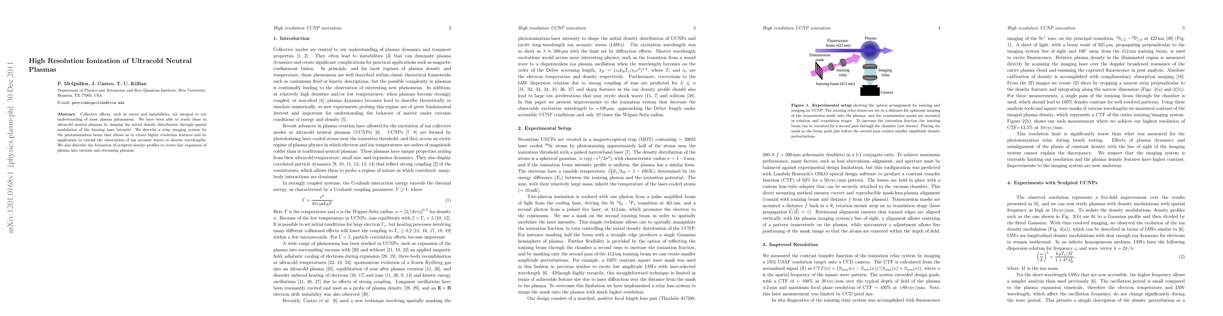 This paper investigates collective effects in ultracold neutral plasmas by shaping initial density distributions using modulated ionizing laser intensity. The study employs a relay imaging system to enhance resolution, enabling observation of ion acoustic waves at shorter wavelengths and the formation of sculpted density profiles for fast plasma expansion into vacuum.