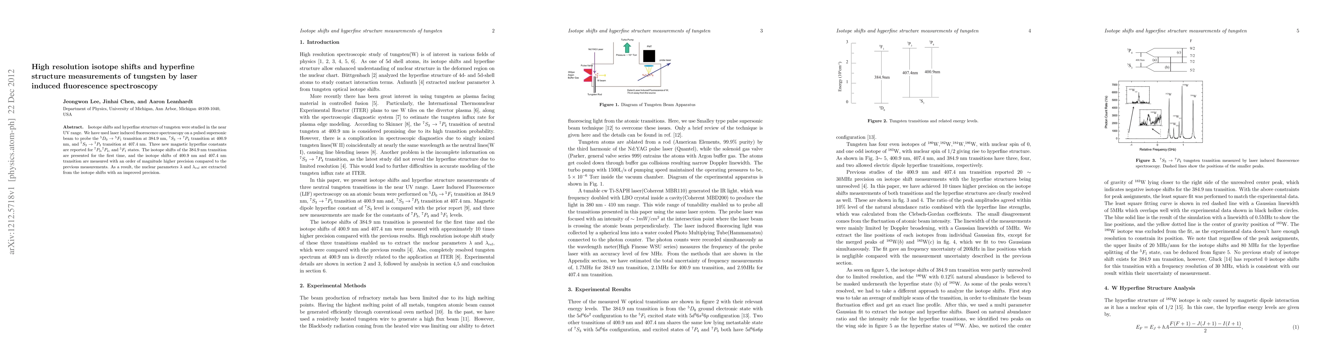 This paper reports high-resolution isotope shifts and hyperfine structure measurements of tungsten using laser-induced fluorescence spectroscopy, achieving significant improvements in precision for transitions at 384.9 nm, 400.9 nm, and 407.4 nm, and presenting new magnetic hyperfine constants for several states.