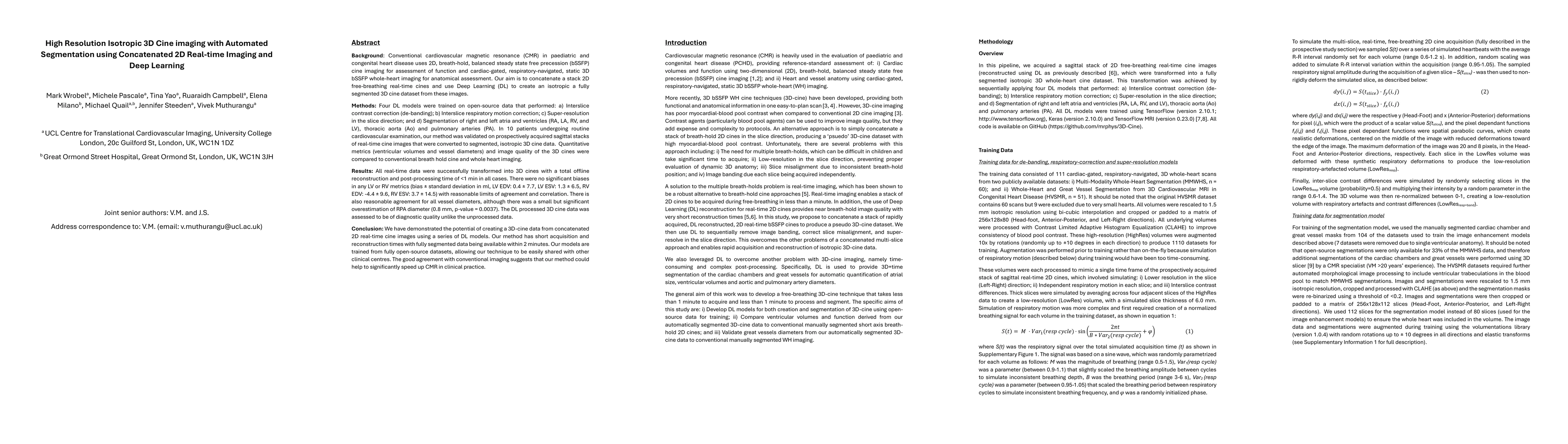 Background: Conventional cardiovascular magnetic resonance (CMR) in paediatric and congenital heart disease uses 2D, breath-hold, balanced steady state free precession (bSSFP) cine imaging for assessment of function and cardiac-gated, respiratory-navigated, static 3D bSSFP whole-heart imaging for anatomical assessment. Our aim is to concatenate a stack 2D free-breathing real-time cines and use Deep Learning (DL) to create an isotropic a fully segmented 3D cine dataset from these images. Methods: Four DL models were trained on open-source data that performed: a) Interslice contrast correction; b) Interslice respiratory motion correction; c) Super-resolution (slice direction); and d) Segmentation of right and left atria and ventricles (RA, LA, RV, and LV), thoracic aorta (Ao) and pulmonary arteries (PA). In 10 patients undergoing routine cardiovascular examination, our method was validated on prospectively acquired sagittal stacks of real-time cine images. Quantitative metrics (ventricular volumes and vessel diameters) and image quality of the 3D cines were compared to conventional breath hold cine and whole heart imaging. Results: All real-time data were successfully transformed into 3D cines with a total post-processing time of <1 min in all cases. There were no significant biases in any LV or RV metrics with reasonable limits of agreement and correlation. There is also reasonable agreement for all vessel diameters, although there was a small but significant overestimation of RPA diameter. Conclusion: We have demonstrated the potential of creating a 3D-cine data from concatenated 2D real-time cine images using a series of DL models. Our method has short acquisition and reconstruction times with fully segmented data being available within 2 minutes. The good agreement with conventional imaging suggests that our method could help to significantly speed up CMR in clinical practice.