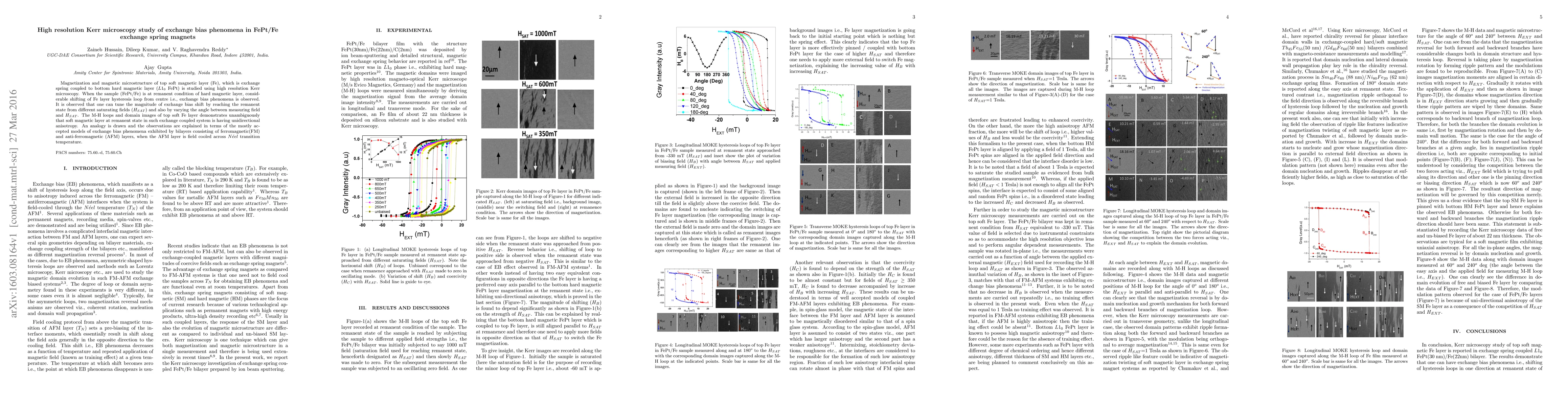 This study uses high resolution Kerr microscopy to investigate the magnetization and microstructure of FePt/Fe exchange spring magnets, revealing significant exchange bias phenomena in the Fe layer. The research demonstrates that the magnitude of the bias shift can be tuned by varying the saturating fields and the angle between the measuring field and the saturating field, indicating the presence of unidirectional anisotropy in the soft magnetic layer.