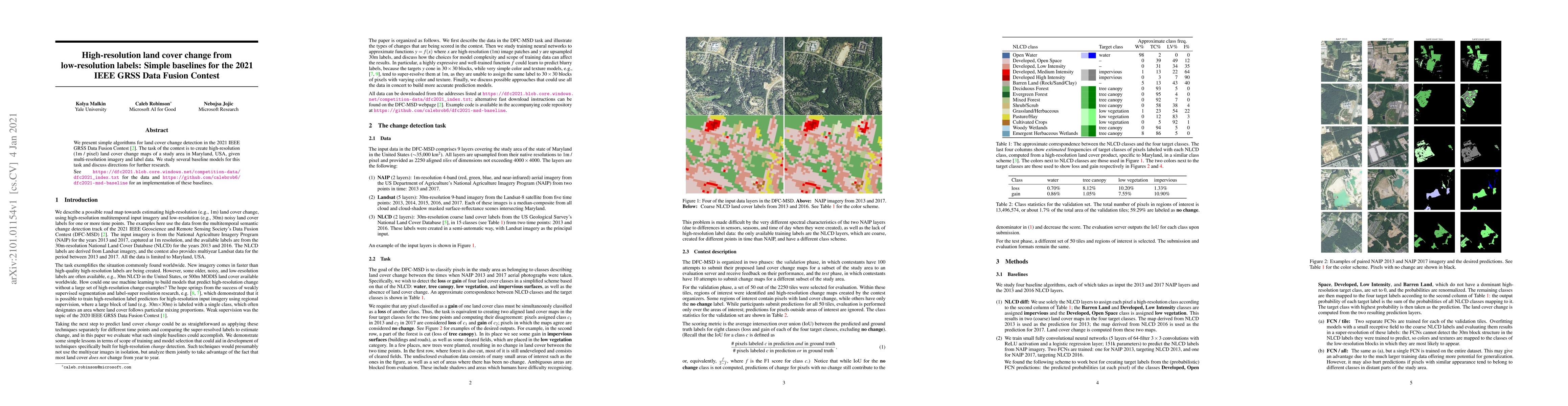 We present simple algorithms for land cover change detection in the 2021 IEEE GRSS Data Fusion Contest. The task of the contest is to create high-resolution (1m / pixel) land cover change maps of a study area in Maryland, USA, given multi-resolution imagery and label data. We study several baseline models for this task and discuss directions for further research. See https://dfc2021.blob.core.windows.net/competition-data/dfc2021_index.txt for the data and https://github.com/calebrob6/dfc2021-msd-baseline for an implementation of these baselines.