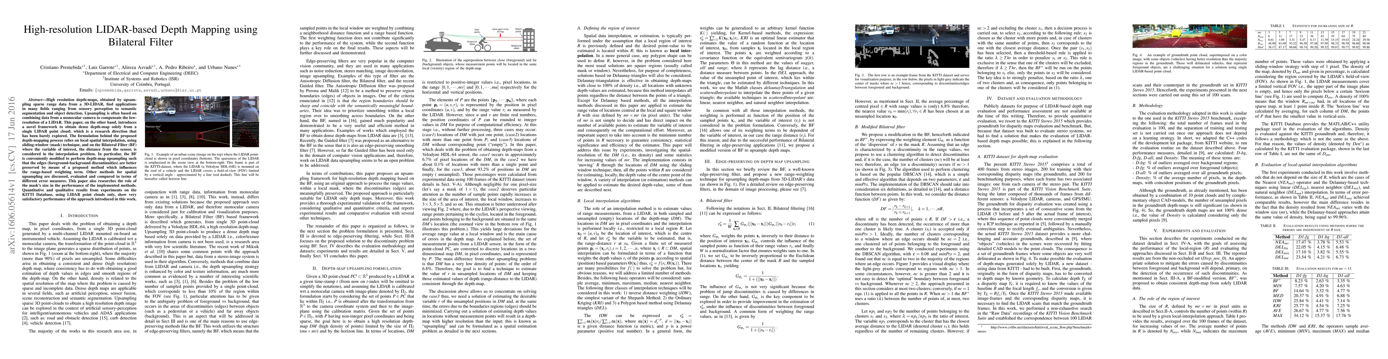 This paper proposes a novel framework for high-resolution depth-map generation from a single LIDAR point cloud using a modified Bilateral Filter for local spatial interpolation and upsampling, achieving better edge preservation compared to other methods. Experimental results on the KITTI Database demonstrate the effectiveness of the approach.