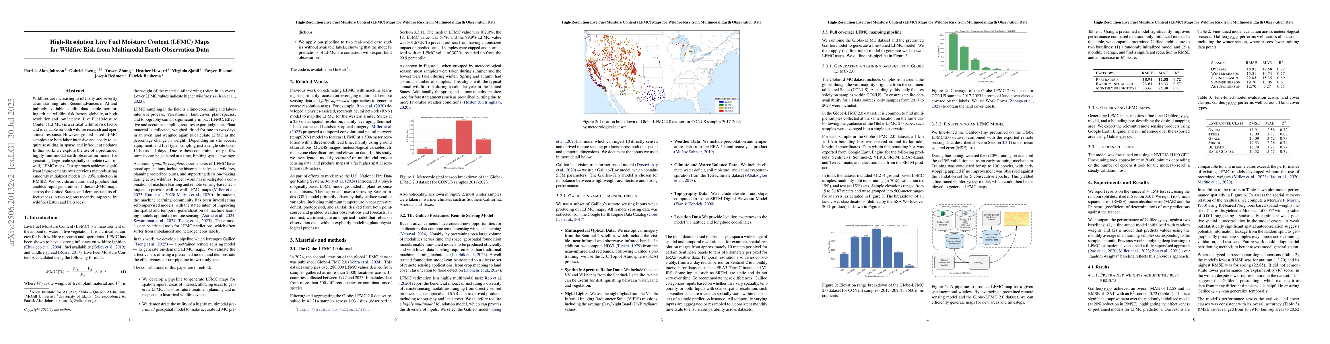 Wildfires are increasing in intensity and severity at an alarming rate. Recent advances in AI and publicly available satellite data enable monitoring critical wildfire risk factors globally, at high resolution and low latency. Live Fuel Moisture Content (LFMC) is a critical wildfire risk factor and is valuable for both wildfire research and operational response. However, ground-based LFMC samples are both labor intensive and costly to acquire, resulting in sparse and infrequent updates. In this work, we explore the use of a pretrained, highly-multimodal earth-observation model for generating large-scale spatially complete (wall-to-wall) LFMC maps. Our approach achieves significant improvements over previous methods using randomly initialized models (20 reduction in RMSE). We provide an automated pipeline that enables rapid generation of these LFMC maps across the United States, and demonstrate its effectiveness in two regions recently impacted by wildfire (Eaton and Palisades).
